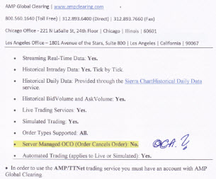 I have found another issue with AMP/TT in that they tell me in response to a query that there is no Server Managed order capability with TT. So, without OCO order types, we are flying blind, if the OCO rests on our own PC's, and lose power or connectivity. Is there a work-around for this? Attached is a clip of a letter they sent me, and I have confirmed it via telephone: (see link) Would using SC data as I plan to do, make a difference? https://www.sierrachart.com/Download.php?Folder=SupportBoard&download=1833 |