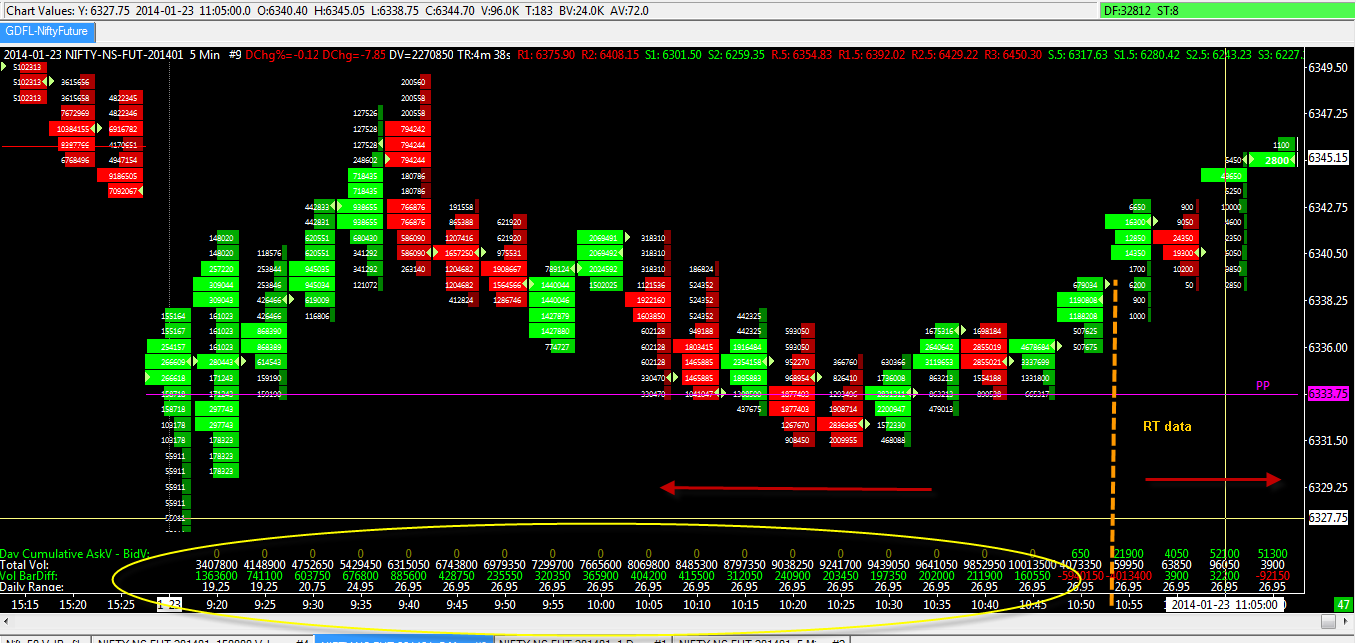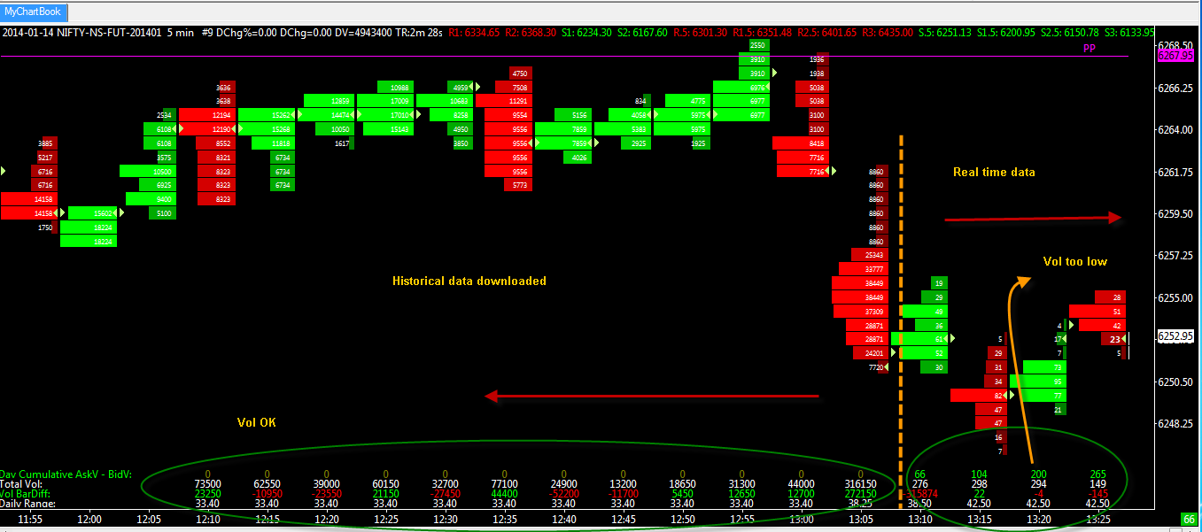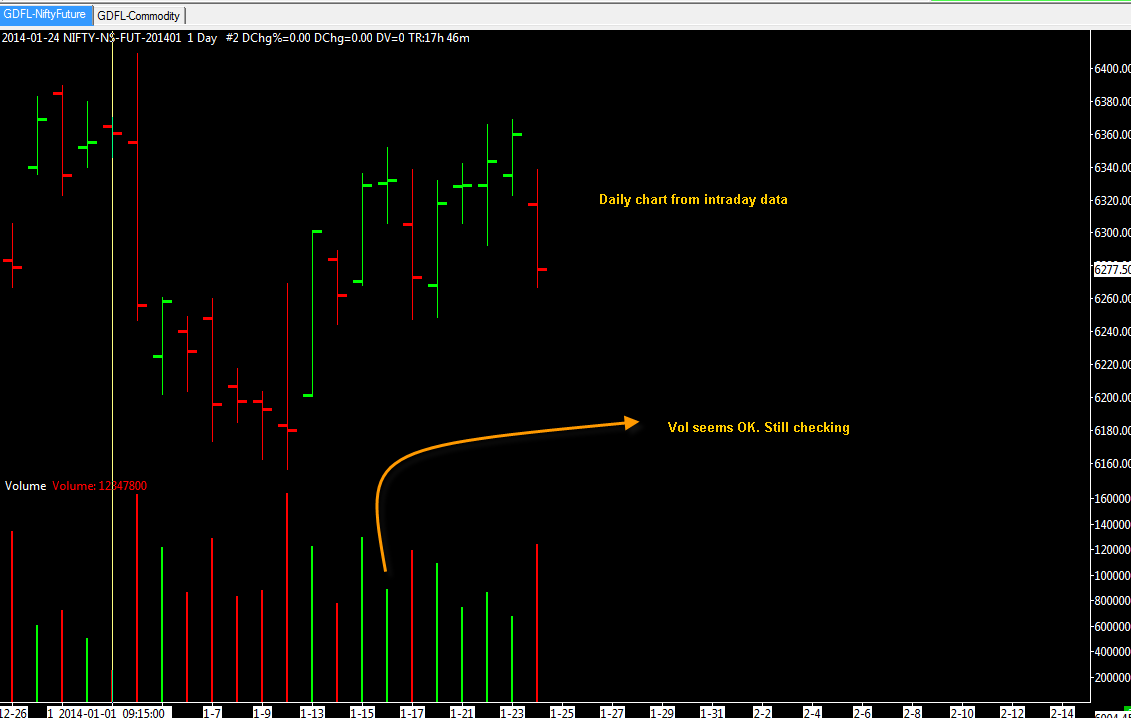 When we saw your post, we had thought, boy that was a dumb mistake. The problem is, they just seem to have changed the data feed. It is not like it was working yesterday when we were making changes. The changes we made, were properly implemented and were giving a logical result in our testing. Now the data feed is working completely differently in regards to volume and this is the problem. We have to contact Global Data Feeds about this. Sierra Chart Support - Engineering Level Your definitive source for support. Other responses are from users. Try to keep your questions brief and to the point. Be aware of support policy: https://www.sierrachart.com/index.php?l=PostingInformation.php#GeneralInformation For the most reliable, advanced, and zero cost futures order routing, *change* to the Teton service: Sierra Chart Teton Futures Order Routing Date Time Of Last Edit: 2014-01-16 08:32:06