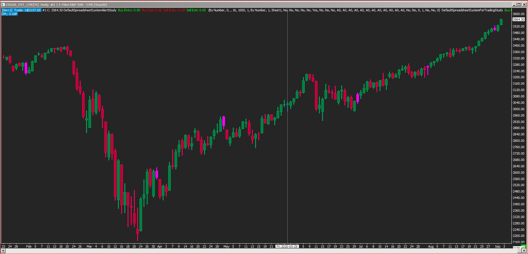 The Simple Alert syntax formulas will work in both the Color Bar Based On Alert Condition study, and the Spreadsheet Formula study. The former will color the price bar with default settings, with the formula on the Alerts tab. The latter will color the price bar if you change the Chart Region to 1 and set the Draw style to Color Bar, with the formula in the Formula field. |