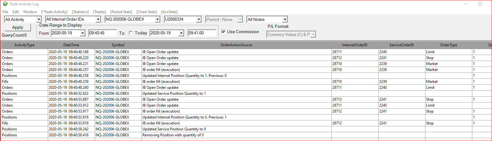 Providing the tradeactivitylog from May 19, 2020. Took a long position on NQ on May 19, 2020 at 9:40:48 EST. I tried moving stop loss to break-even by pressing F2 and did not work. Closed trade at 9:40:53 AM EST. I have also attached the Trade Activity Log for May 19 (I only had 1 trade that date) and see multiple InternalOrdersID at 9:40:48 AM EST. |