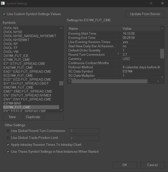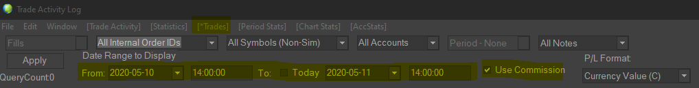Hey Acro, 1st, I use AMP + SC + Denali TTfix to execute trades. Something you can do is go into: Global Settings > Symbol Settings > check "Use Custom Symbol Settings Values" and find what you trade and set the Round Turn Commission. To do this, on the right side, scroll until you see "Round Turn Commission" and set that to your Round Turn Commission from AMP (use Amp's All-In Calculator to find where you should stand on your commission rates). See attached screenshot for what this looks like. Then, once AMP's Daily Client Report is sent to you after your current trading day (which covers trading from 5 PM Eastern to 5 PM Eastern time every day) you open the following in SC: Trade > Trade Activity Log -- and set the "Data Range to Display" according to your timezone. Make sure you then press [*Trades] then Apply. If you scroll to the bottom of the page, your Total from the Profit/Loss column should exactly match AMP's Daily Client Report for the last of the "5 values" summary at the bottom of the last page. It literally takes me 10 seconds each day to make sure the tally is correct. :) |