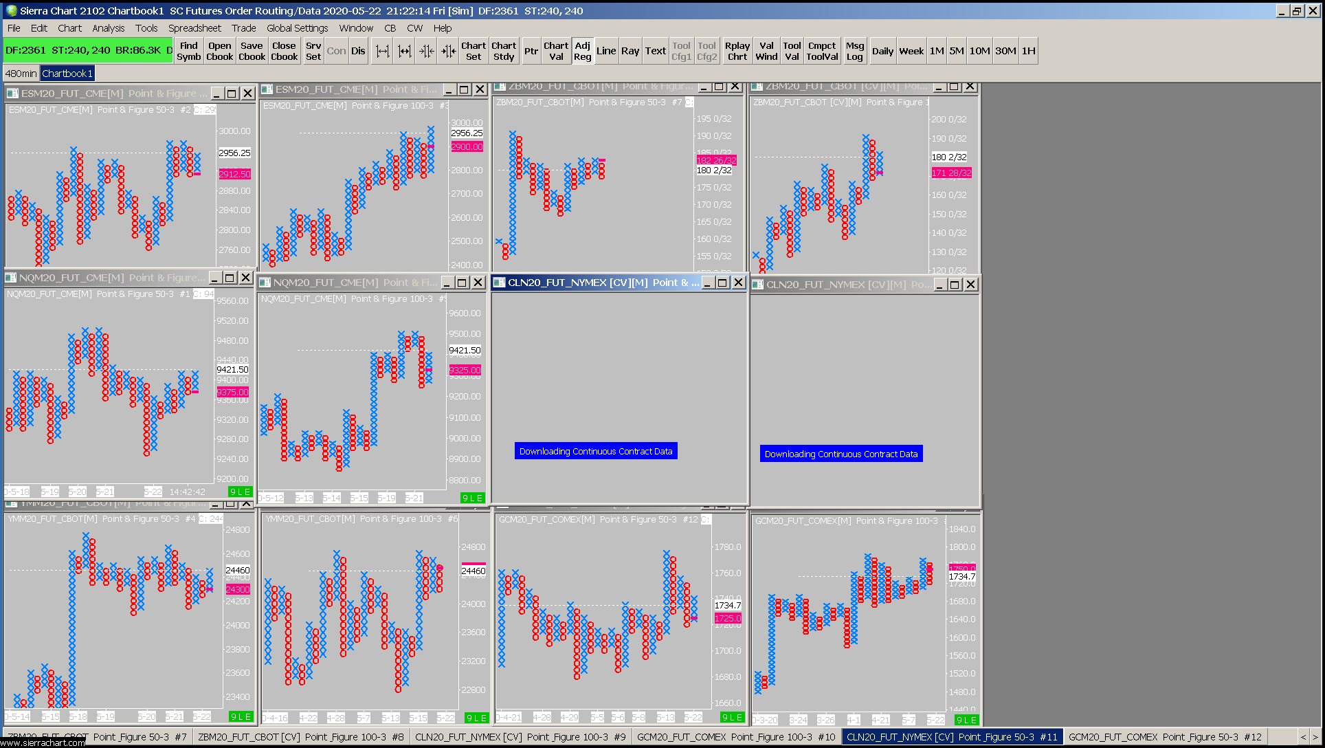 Sierra Users, I could use some help if anyone is inclined too. I've created a chartbook with 28 different markets (ex. ES,NQ,YM,RTY,ZB,ZN,DAX,etc.....56 total charts). I only have P&F charts in this chartbook, Each market has a 50x3 & 100x3 and each P&F chart has the study named Point and Figure reversal bar marker and thats it. I would like to create a spreadsheet/list that shows the Point and Figure reversal bar marker price/value for each chart. Could someone point my in the right direction on how to complete this task? I've attached a screenshot of some P&F charts w/ rev. bar marker(reddish pink highlighted value). Thanks Sierra users and I hope someone's willing to give me some direction. http://www.sierrachart.com/image.php?Image=159020053286.png |