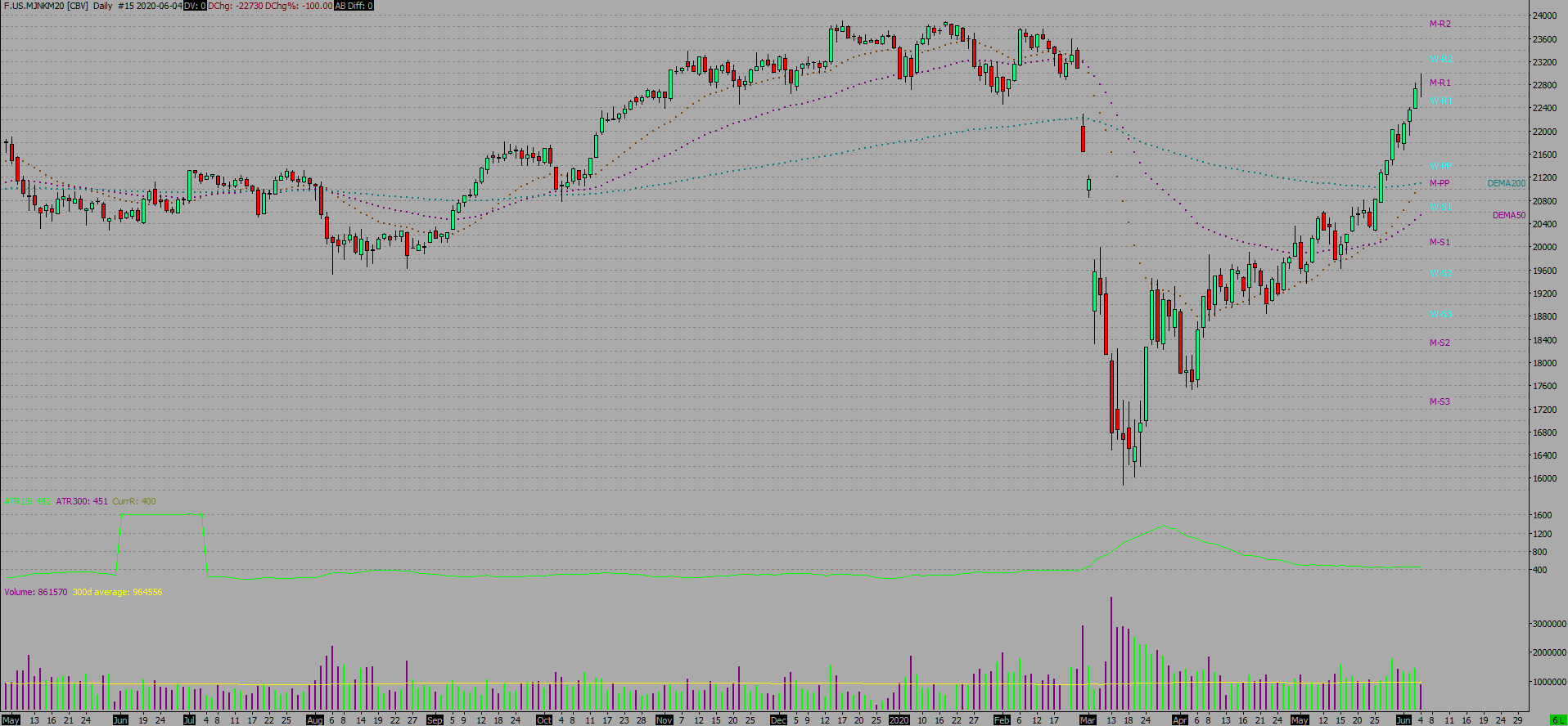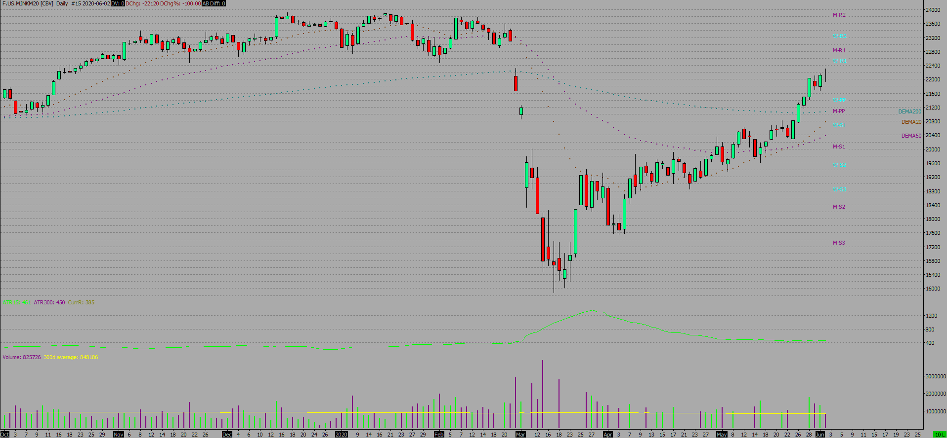 I believe you obtain the daily historical data for this symbol from BarChart. As you can see in the attached Daily Chart - Region 3, that there are numerous days since the start of this calendar year where there is no daily volume (however Intraday charts are fine). Eg: 21 Jan, 19 Feb, 10 & 16 & 17 Mar. Coupled with numerous dates in Apr and May ie the problem seems to be getting worse. I have deleted all MJNK (Osaka exchange) data and reloaded with no difference. Any chance you can ask BarChart to check this on their end? Cheers http://www.sierrachart.com/image.php?Image=1591064980464.png |