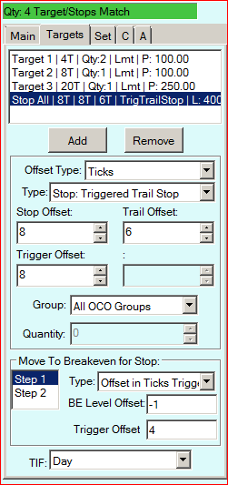 Hi, New to SC and trying to figure out how to setup the following Attached/OCO automation to happen when I place an order. I am going through the help materials, but am having difficulty figuring out how to get this logic into the Targets tab. Trade logic: 1. Buy/Sell STOP xx amount of lots 2. Stop Market Stop Loss at 8 ticks and close out all lots if hit 3. Profit Target #1 at 4 ticks, when hit close out 50% of lots; and Move Stop Loss to BE+1 tick for remaining lots 4. Profit Target #2 at 8 ticks, when hit close out 50% of remaining lots, create Trailing Stop Loss of 6 ticks (not sure how this effects original Stop Loss). 5. Profit Target #3 at 20 ticks, when hit close out 100% of remaining lots. Essentially trying to get 4 ticks profit on 50% of lots, with a SL protecting 100% of the lots, and then have one runner, and then a second runner leg. If we cannot use % of lots to buy/sell logic, that is fine, I can use a fixed number of lots for each. The area I am having particular difficulty with is figuring out how to move the original Stop Loss that is set with the order to become a trailing stop loss further into the trade logic described above. It is not clear to me if I should be attempting this using a 'Single Common Stop' that has some 'Move to Breakeven for Stop' logic, or using a different 'Type' of Stop altogether. The attached image is my attempt at this (minus the percentage to close out as described above). Any help would be greatly appreciated! Cheers Date Time Of Last Edit: 2020-08-02 22:31:29