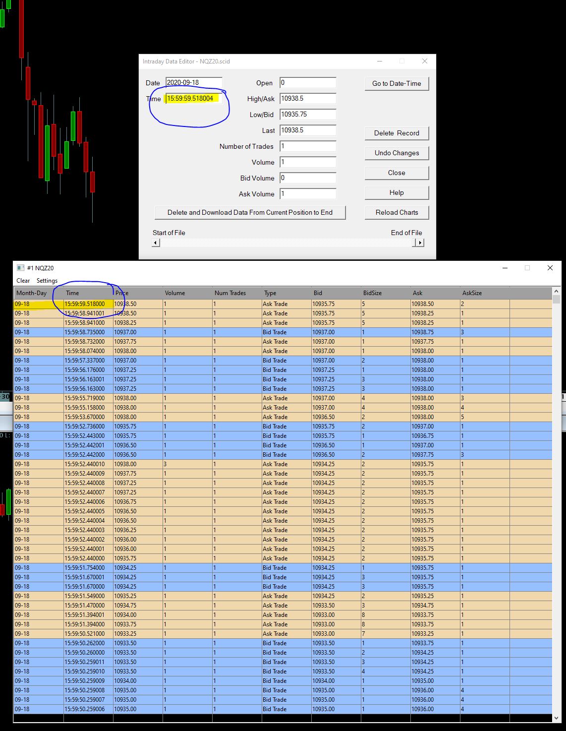 SC Team - Attached is the image of NQZ20. As you can see from the image - T&S Very last record was at 15:59:59:518000. In intraday file - there are additional records ( 4 Records - They keep increasing when you disconnect & Connect). 15:59:59:518001 15:59:59:518002 15:59:59:518003 15:59:59:518004 in Case of ES - There are 9 records in intraday file extra compared to last Time and Sales records. Would you please check and confirm as this is causing issues for various studies which expects T&S and charts/intraday files to be in sync? Edit - It appears like when there is a TS_MAKER record some how triggering the incorrect intraday record. Thanks Date Time Of Last Edit: 2020-09-20 01:12:33