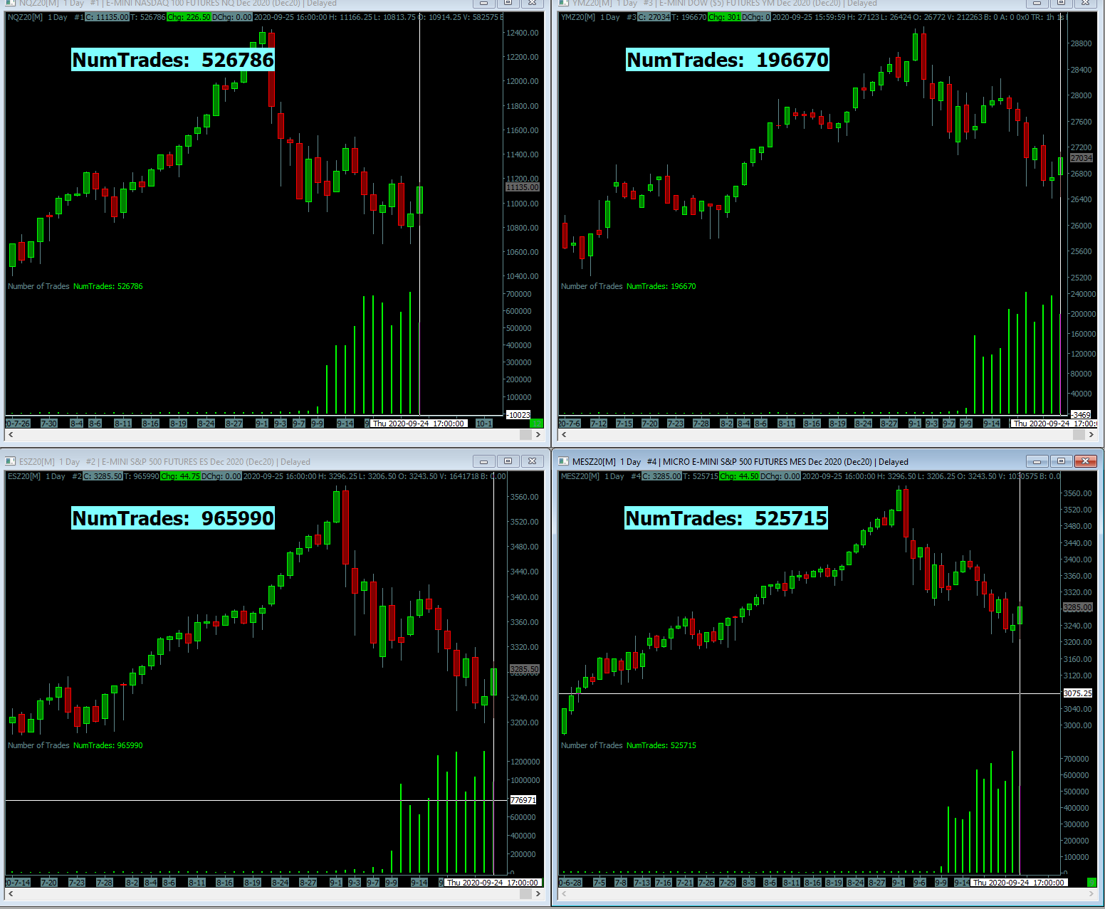 Here it is from live feed - Today market is closed and have to deal with increasing number of trades on their own. First image captured in the morning(this is after correcting the data using delete/download option) and second image captured in the evening ( all of this under normal circumstance). So this process of incorrect data is NON-stop even if the market is not open. Main instance / live denali feed. Attached is the small portion of log from the message log - when this auto triggered. As you can see it has added 1-4 records on it's own with triggered historical download (though these records are ALREADY part of intraday file. This produces the incorrect count for a trading day. Even if the data is corrected using "delete and download" option for the last trading day - it's NOT guaranteed to stay accurate as another auto triggered historical event would again add additional intraday records making it incorrect again. No historical data client is currently set to download historical Intraday data for YM?##_FUT_CBOT. | 2020-09-26 18:05:14.304