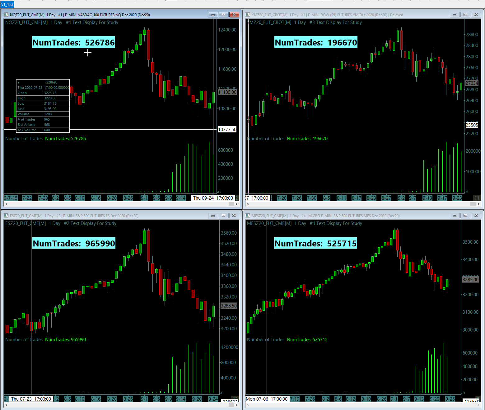 Uploading the video showing the same as well as the chartbook. The study inserted in Number of Trades study + Text Display for the study. All I am trying to do - disconnect/reconnect. This is the main instance. You can see for all the charts - the count increases by 1 - (Market is currently closed). Also noticed - if there is a SC triggered Historical download event (which happens periodically on its own) - Then also this count increases by 1. Only way to fix - "Delete and download" the very last day for each of the instruments. Thanks Date Time Of Last Edit: 2020-09-20 20:12:42