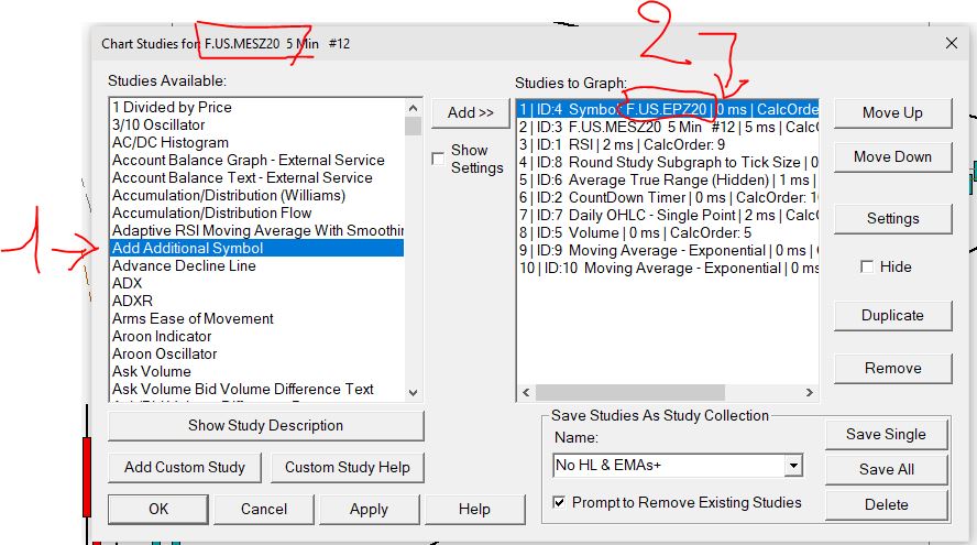 Sorry for the late reply. Please find attached what the problem is and below you can find the explanation as well. I hope this clarify it. As you can see from the pic, I add (1) the study called "Add additional Symbol" to the main price chart (which is the Micro S&P as shown in the upper red box) From the setting of this study, I choose to display (2) EP (Emini S&P) on the same chart and overlay it on the Micro S&P. If I create a collection study as explained in the previous message and I want to use it on different charts (i.e. Gold, Crude etc)I have visual problems because everytime I apply the study collection, the "Add additional symbol" study will be add to the chart which main market is for example gold, going to overlay the Emini S&P to gold. And, on the other hand, if I create a study collection where this study isn't present, then when I recall the study collection on the Micro S&P, the overlay isn't present, and I have to go and add the overlay every single time. The question is then, is there a way to be able to create study collections without having such a problem? I hope I explain the problem, if not please let me know. Thanks, Fabio |