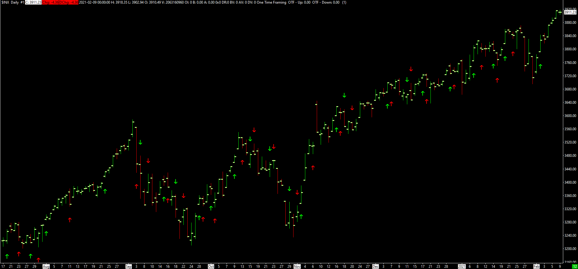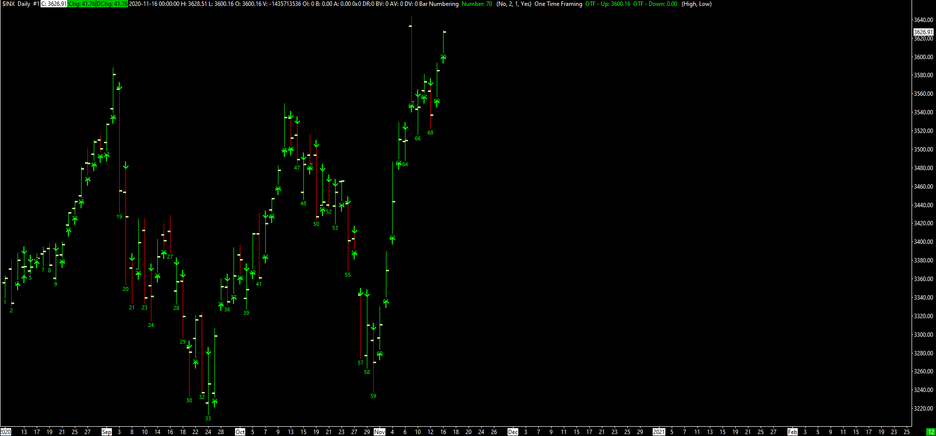 I have coded this study based on the description given in Post #3. The study contains two Subgraphs: 1) OTF - Down, which equals the High when High < High[1] and equals 0 otherwise. If this Subgraph is nonzero at a bar, then a downward arrow is placed at the High for that bar. 2) OTF - Up, which equals the Low when Low > Low[1] and equals 0 otherwise. If this Subgraph is nonzero at a bar, then an upward arrow is placed at the Low for that bar. Note that any given bar can be both OTF - Up and OTF - Down, as is the case with Bar #4 in the attached image. Let us know if this is what you had in mind. If so, then I will submit the code to Sierra Chart Engineering. Date Time Of Last Edit: 2020-11-17 08:31:29