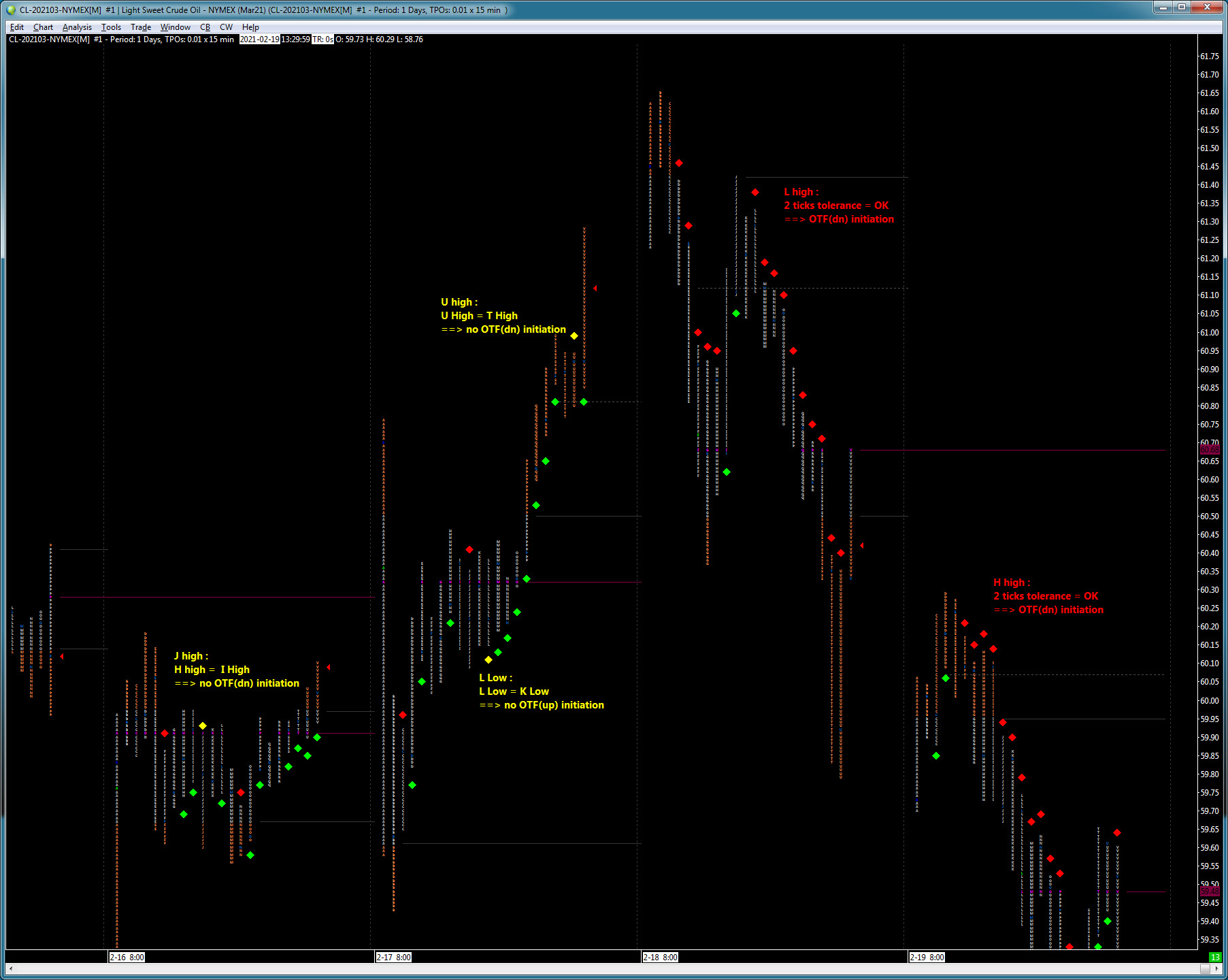 See image for illustration of strict higher highs ; CL, 15 mn TPO, 2 ticks For futher evaluation of OTF(up) state, I define a threshold level : LastStrictHigherLow, noted LSHL. I will compare current Low to this threshold, as I don't want an endless downside drift each time within the N*s limit. Condition for OTF(up) state exit : LSHL=max(LSHL[1),L[1]) // LSHL is the max of previous Last Strict Higher Low and previous Higher Low LastStrictHigherLow - N*s > L // Compares last Low below previous Low minus N*s Jope this help. Sorry again for my mistake. JM |