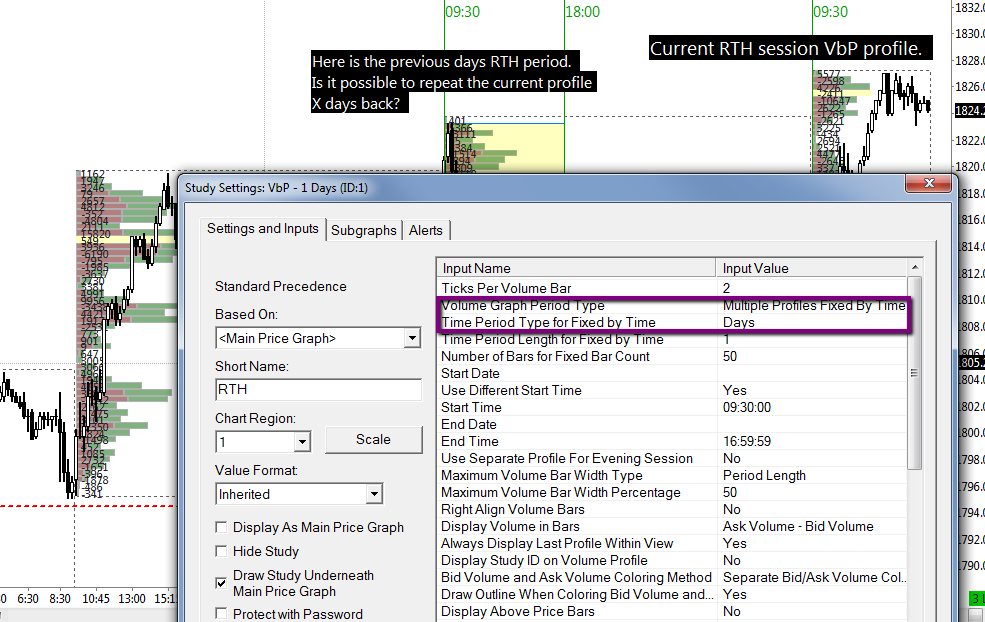 Hello, Is it possible to set VbP or DVP tool to auto draw profiles automatically for the selected time period, X days back? That is, say on a 15 or 30 or 60 minute chart a profile is automatically drawn with start time and end time for RTH session, for say the last 5 days, for each day. If possible, how do I set that up? Attached is a chart image to better help describe the question. Thanks. Date Time Of Last Edit: 2014-02-13 22:30:05