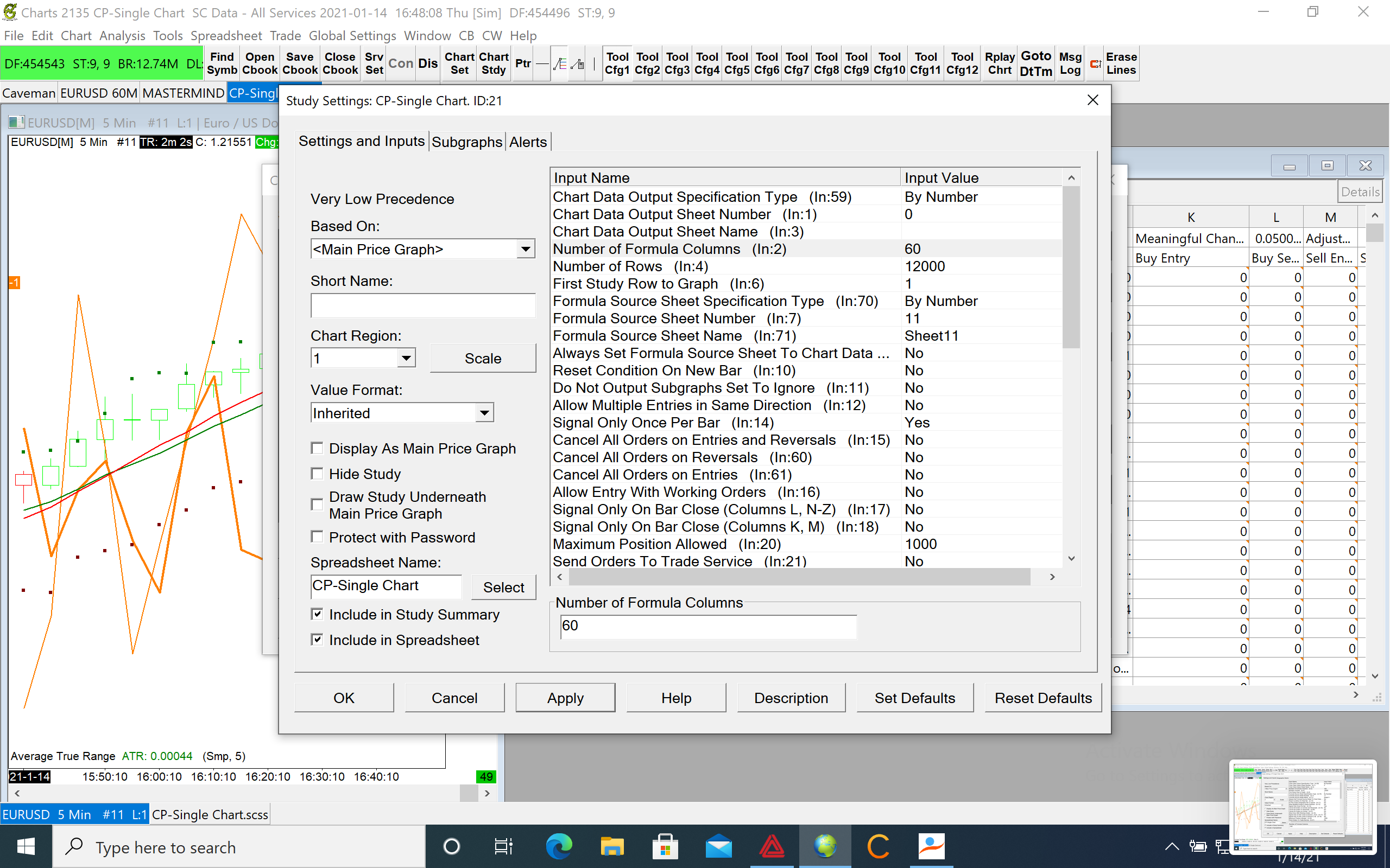Hi, I'm just wondering if there is any way to get more than 60 formula columns in the spreadsheet system for trading. I open up the studies for the spreadsheet system, and under the "Number of Formula Columns (ln:2)" I change the number to 80, 100, 120. But whenever I hit apply, it just goes back to saying 60. I'm just doing a lot of analytics work and would love to have more columns to do formulas on. Thank you for your time. Attached are two screen shots, attempting to set the formula columns to 100, hitting apply and having it reset to 60.