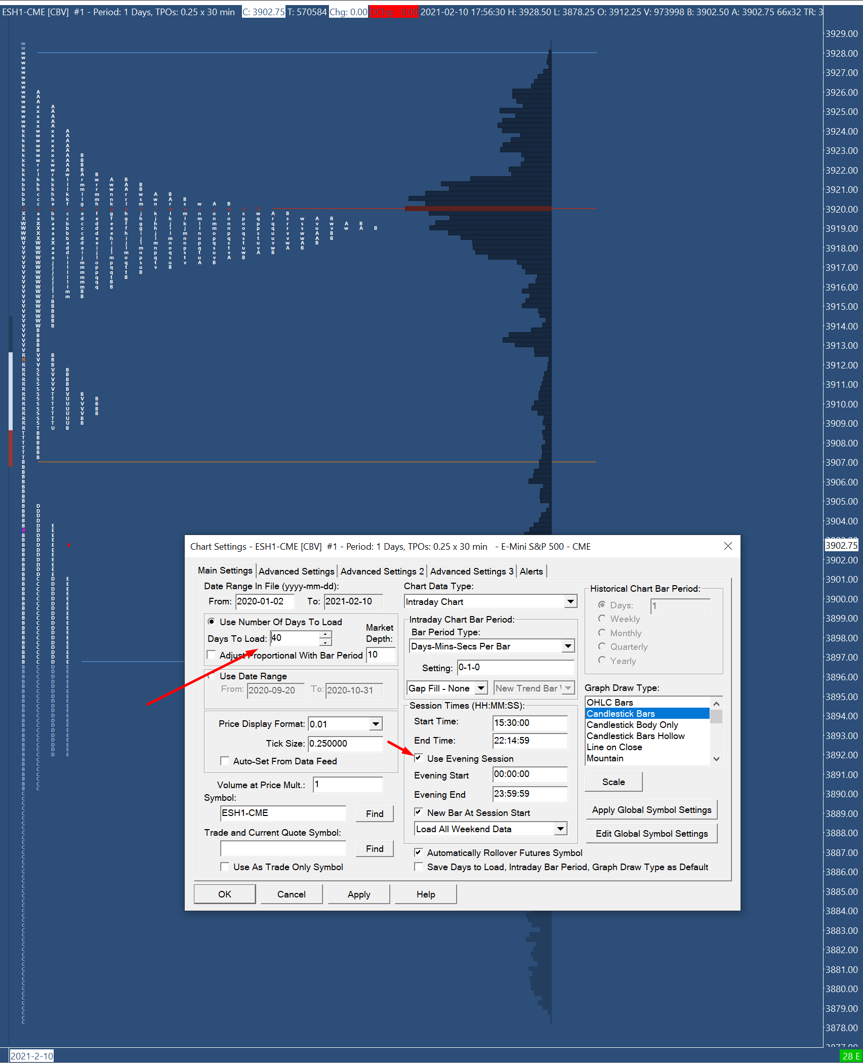 I currently have the problem that the software only loads one day of data if I set my market profile chart to evening session, although in the chart sessions I have set it up to load 40 days. If I switch to intraday session times, the 40 days are loaded and displayed correctly. Also, in all other candlestick charts I have opened everything works fine in evening as well as intraday session. Is there a certain parameter within the market profile settings I have to change to make this work?