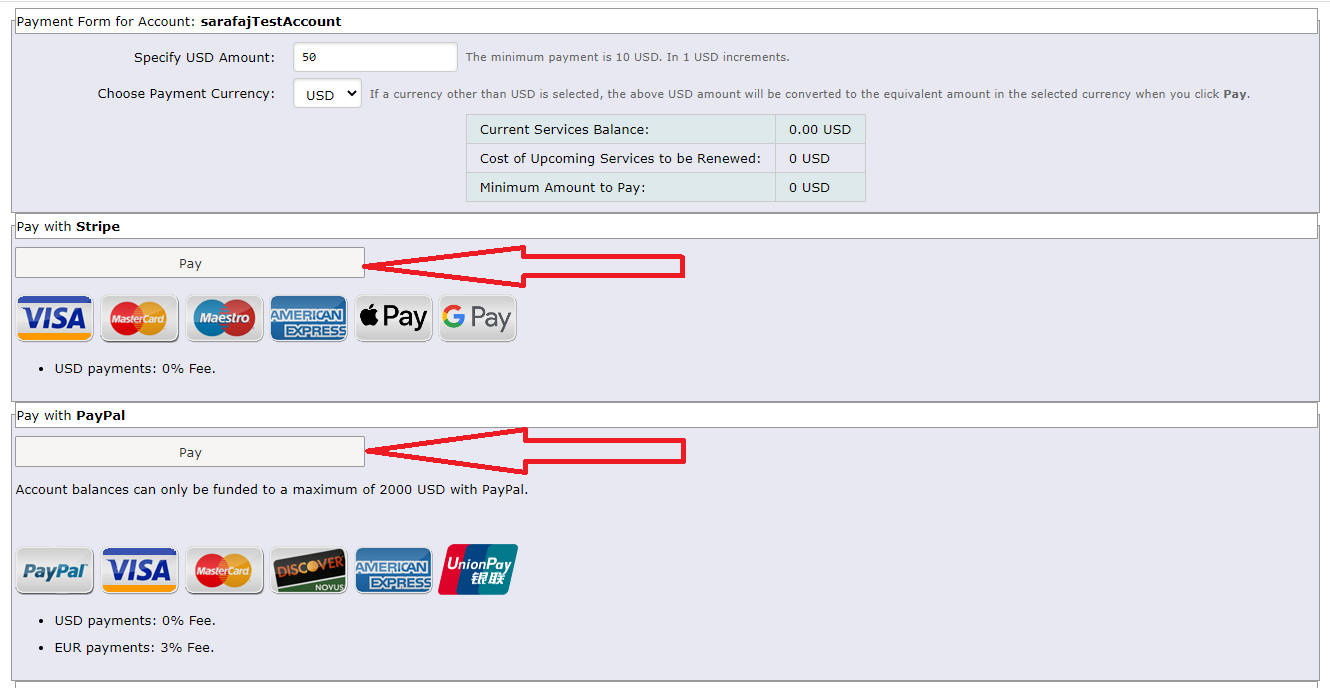 Refer to the image attached. You enter the amount you want to pay at the top of the page then select the "Pay" button for the payment method you want to use (Stripe or PayPal). Choose one payment method, not both.