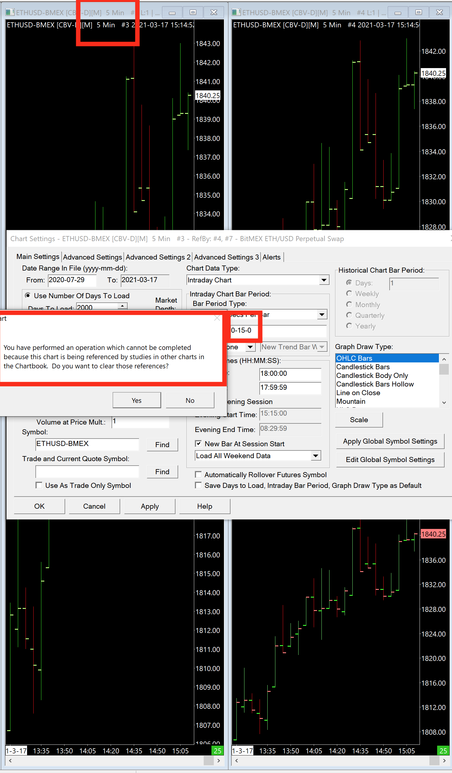 Hello: I am trying to overlay a 15 min OHLC (main price) bar onto a 5 min chart. As instructed in the Overlay Bar study page https://www.sierrachart.com/index.php?page=doc/StudiesReference.php&ID=100#Overlay_-_Bar - (Fig A) I opened the charts side by side - (Fig B) Then, in the destination (5 min) chart, I added the overlay bar study with 15 min as input. However, as soon as I do this, the 15 min chart changes its time period to 5 min. This is very strange as I do not do any operation on the 15 min chart. Are my inputs to the Overlay chart ok? - As the 15 min chart becomes a 5 min chart, the Subgraph 5 (in the 5 min chart) now displays another 5 min chart. I wanted a 15 min OHLC bar chart here. - (Fig C) If I try to restore the time period of the original 15 min (from 5 min) to 15 min, I get an error, "You have performed an operation that cannot be completed because this chart is being referenced by studies in other charts in the Chartbook. Do you wish to clear those references?" - The only way for me to restore the 15 min chart to the original state is to delete the Overlay bar study. Can you please help me understand the proper settings over the Overlay Bar study? On a sidenote, I have tried the Add Additional Symbol study but don't think that suits my needs here as I want higher time scale charts, not a different symbol at the same time frame. |