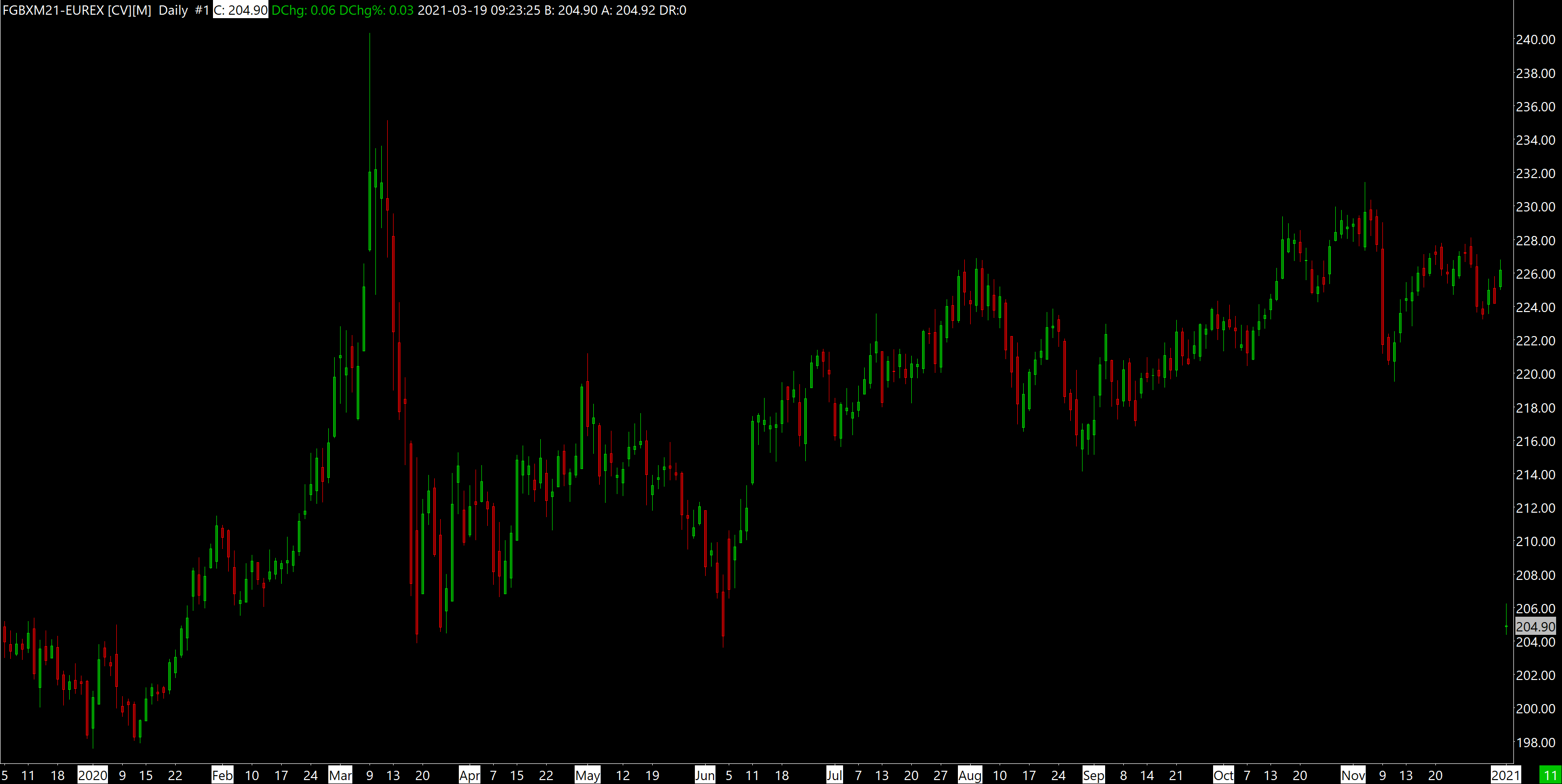 Hello, I am having all sorts of errors with continuous contracts of Eurex symbols, both with Interactive Brokers trading service and SC Data. IB : DAX-202103-DTB-EUR-25 [CV] Daily doesn't show the days between 2021-01-12 and today. Same for GBL-2021-06-DTB [CV]. SC Data : FGBXM21-EUREX [CBV] Daily shows no data between 2020-12-07 and today. Same for FGBLM21, FGBSM21, FOATM21, FBTPM21... I have already tried to Delete all data and download. Thank you Date Time Of Last Edit: 2021-03-18 09:49:33
