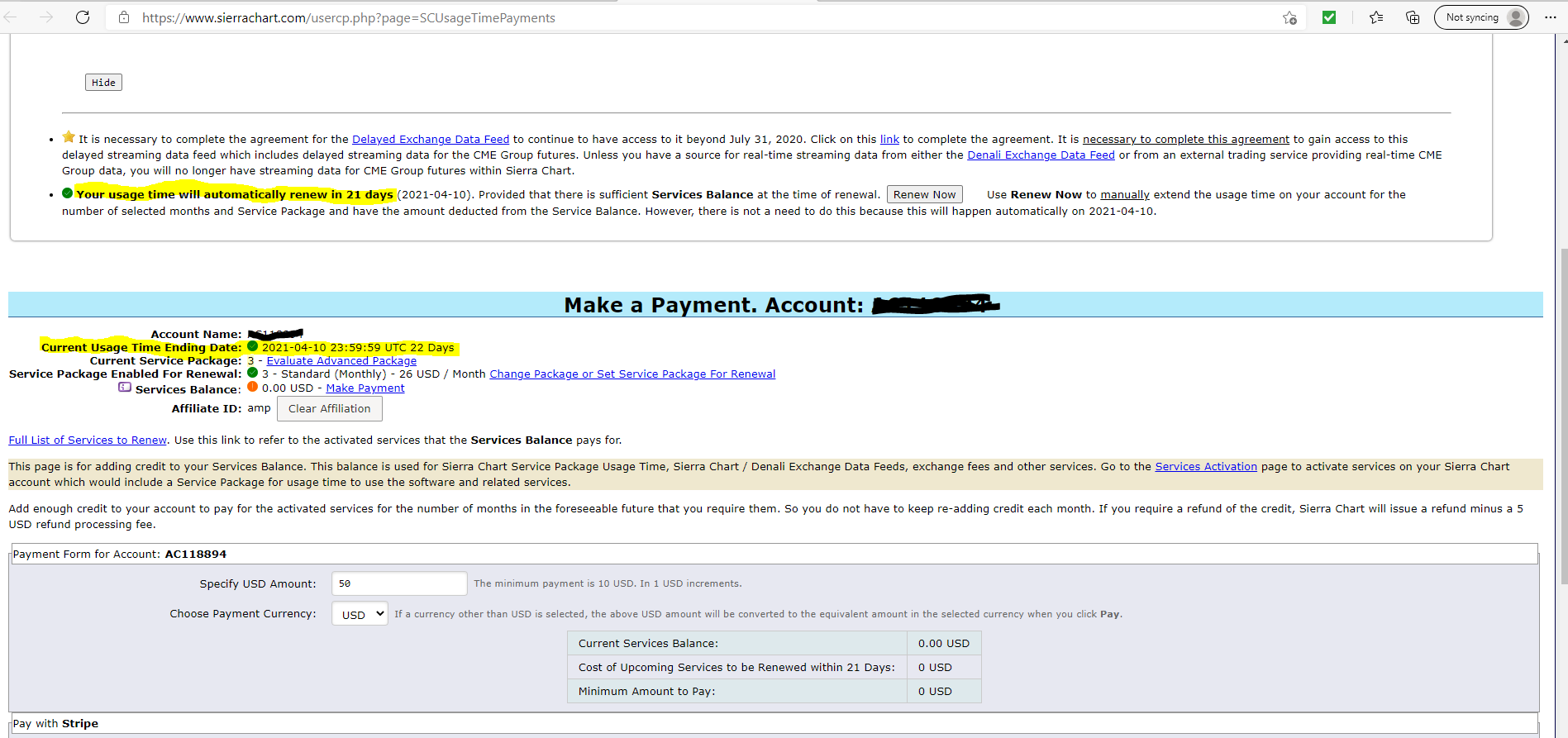 May you explain this to me? It says I have 21 days left before next automatic renewal. I have account with AmpFutures and use Sierra Chart Pkg.3(Free) via them. So after April 1st, will I still be using the platform w/o paying until April 10 or will this message in attached pic be cancelled and I will have to pay April 1st to continue use