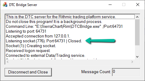 The Message in DTC Bridge Server: "Listening socket (776). Port 64731 | Closed. Has nothing to do with my Sierra account belonging to AMP? I thought it was, because in 2019 when I tried to use TOPSTEP it did not work with my amp account as well. I had to use my own. |