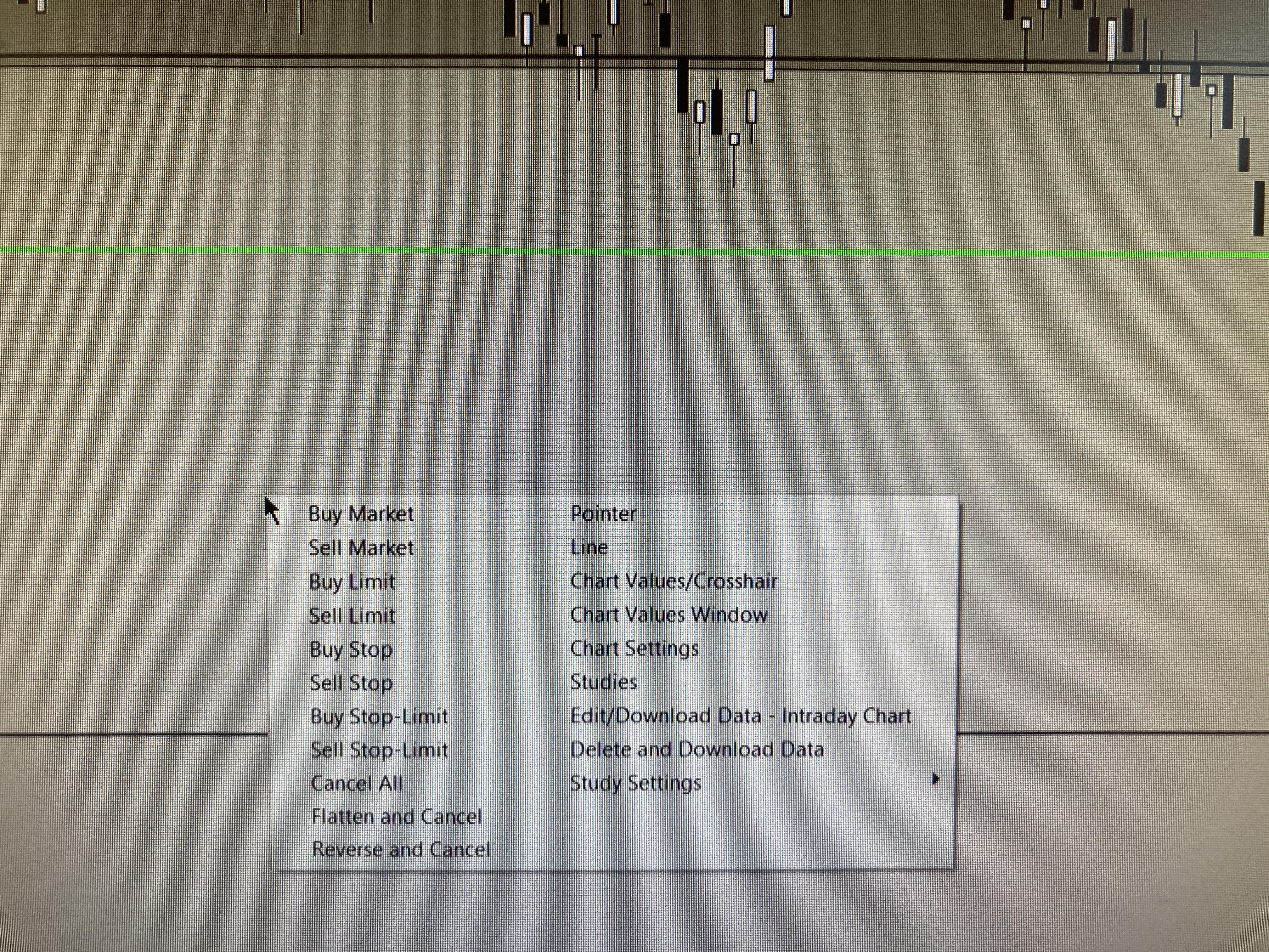 Refer to: Global Settings Menu: Customize Chart Shortcut Menu (Global Settings menu) Global Settings Menu: Customize Chart Trade Menu (Global Settings menu) Sierra Chart Support - Engineering Level Your definitive source for support. Other responses are from users. Try to keep your questions brief and to the point. Be aware of support policy: https://www.sierrachart.com/index.php?l=PostingInformation.php#GeneralInformation For the most reliable, advanced, and zero cost futures order routing, *change* to the Teton service: Sierra Chart Teton Futures Order Routing |