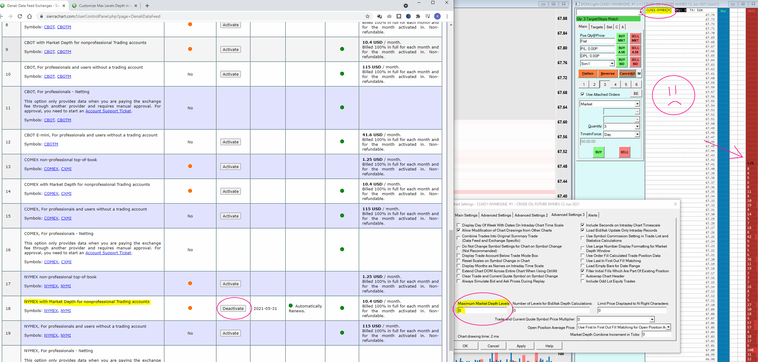 Hi Team, I have a denali feed with Market Depth for Nymex and although my price ladder has a "Maximum Market Depth levels" set to 0, it's not working as expected. Is there an issue with my account ? I tried to wait for a day but is still have not full prices. Could you please let me know if i have missed something or if there an issue with my account? it used to work pefectly before when i had it for full CME. Thanks you |