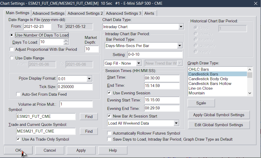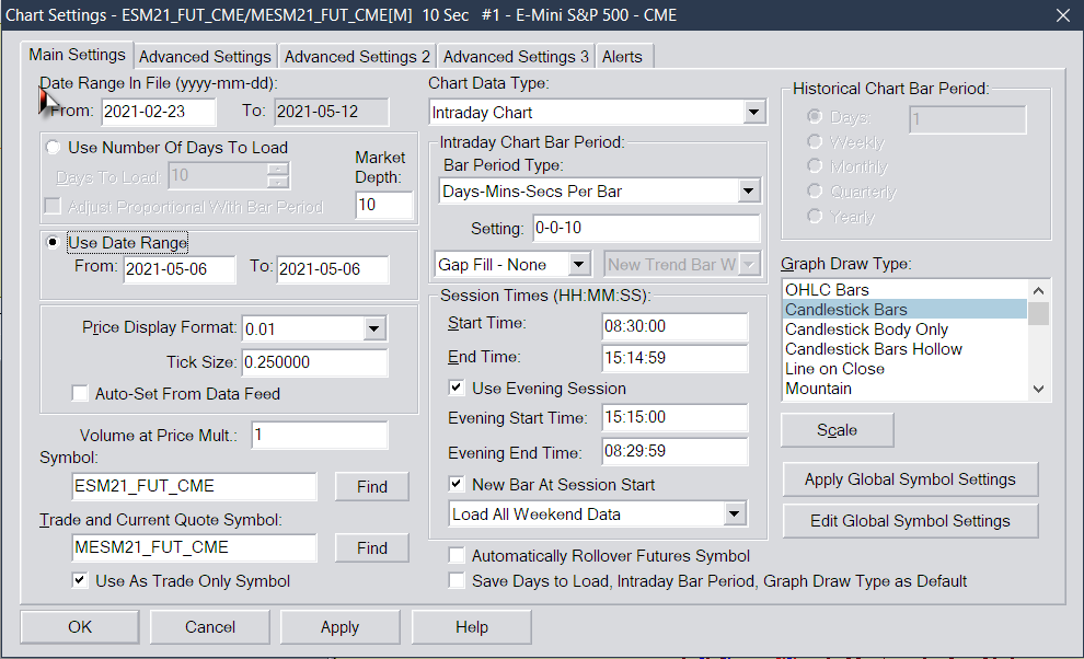 First, the images you are showing are inconsistent. You show Depth Data on 5/6 around 08:50, but then when you show the replay you are showing 5/9 around 17:00. Additionally, you are only showing a few bars in the chart on 5/9. So, if you have the Market Depth data on 5/6, then when you run the replay do you have the Market Depth data on 5/6? Additionally, you do not need to load the 61 days of Market Depth. This is what we are trying to tell you. Just leave that setting at 10. And as long as you have Market Depth for the day in question (5/6) then, when you run the Replay, it will display the Market Depth for that day, as at that point, it is the current day and will be included in the 10 days of Market Depth to load. One final pointer, when wanting to look back at a specific day, use the Use Date Range option and set it to the day you want. So when you want to see if there is depth data on 5/6, just enter 2021-05-06 for both the From and To date range. You will then get just that day displayed in the chart. For the most reliable, advanced, and zero cost futures order routing, use the Teton service: Sierra Chart Teton Futures Order Routing |