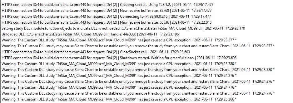 SC Version 2273. Notepad++ v7.8.2 64 bit. For this test I created a new chartbook and chart. Only chart in the chartbook. I used the simplest cpp I have. I've attached as a file. I id three separate tests in sequential stages of DLL development. Test 1: Remote build with no existing DLL. Software version: 2273 64-bit | 2021-06-14 11:31:12.449 Primary Thread ID: 14424 | 2021-06-14 11:31:12.449 Usage end date: 2021-07-15 | 2021-06-14 11:31:12.449 Enabled for: Advanced Features 2. | 2021-06-14 11:31:12.449 Enabled for: Sierra Chart Historical Data Service. | 2021-06-14 11:31:12.449 Enabled for: Denali Real-Time Exchange Data Feed. | 2021-06-14 11:31:12.449 Enabled for: Delayed Denali Exchange Data Feed. | 2021-06-14 11:31:12.449 Enabled for exchange2: CME (Trading Account Required) | 2021-06-14 11:31:12.449 Enabled for exchange2: CBOT (Trading Account Required) | 2021-06-14 11:31:12.449 Enabled for exchange2: COMEX (Trading Account Required) | 2021-06-14 11:31:12.449 Enabled for exchange2: NYMEX (Trading Account Required) | 2021-06-14 11:31:12.449 Allow Support for Sierra Chart Data Feeds is enabled. | 2021-06-14 11:31:12.449 Current selected Data/Trading service: SC/TT Futures Order Routing | 2021-06-14 11:31:12.449 Custom symbol settings values: disabled | 2021-06-14 11:31:12.449 Chart Update Interval: 500 | 2021-06-14 11:31:12.449 Intraday Data Storage Time Unit: 0 | 2021-06-14 11:31:12.449 Time Zone: -05:00:00 (CST-06CDT+01,M3.2.0/02:00,M11.1.0/02:00) | 2021-06-14 11:31:12.449 2021-06-14 16:31:12 Local computer time in UTC | 2021-06-14 11:31:12.449 2021-06-14 11:31:12 Local computer time in SC Time Zone | 2021-06-14 11:31:12.449 2021-06-14 16:10:11 Server time in UTC | 2021-06-14 11:31:12.449 Local computer UTC time and Server UTC time difference: 1 seconds. | 2021-06-14 11:31:12.449 Program path: C:\SierraChart\ | 2021-06-14 11:31:12.449 Data Files path: C:\SierraChart\Data\ | 2021-06-14 11:31:12.449 OS Version Number: 10.0 | 2021-06-14 11:31:12.450 Locale Setting: C | 2021-06-14 11:31:12.450 DLLs: ETFISv3_64.dll, sst_FreeBundle_64.dll, TriStar_BaseDataAccess_MD99_64.dll, TriStar_DeltaAudioAlerts_MD99_64.dll, TriStar_DojiBar_MD99_64.dll, TriStar_ExtDeltaDifSignals_MD99_64.dll, TriStar_FlexRenkoPredictor_MD99_64.dll, TriStar_FL_BarColor_MD99_64.dll, TriStar_FL_Bolic_MD99_64.dll, TriStar_FL_Parabolic_MD99_64.dll, TriStar_FL_VS_FlipZone_MD99_64.dll, TriStar_FL_VS_MD99_64.dll, TriStar_FoMRelVol_MD99_64.dll, TriStar_FootprintAudioAlerts_MD99_64.dll, TriStar_FP_Parabolic_MD99_64.dll, TriStar_FuseLines_MD99_64.dll | 2021-06-14 11:31:12.450 Allowed protected custom studies: SST_FreeBundle, zyp_download_free | 2021-06-14 11:31:12.450 ESU21_FUT_CME 1 Min #1 | Reloading chart. | 2021-06-14 11:31:17.280 HTTPS connection ID:2 to build.sierrachart.com:443 for request ID:2 (2) | Creating socket. Using TLS 1.2. | 2021-06-14 11:33:31.535 HTTPS connection ID:2 to build.sierrachart.com:443 for request ID:2 (2) | New receive buffer size: 32768 | 2021-06-14 11:33:31.535 HTTPS connection ID:2 to build.sierrachart.com:443 for request ID:2 (2) | Connecting to IP: 88.99.0.216. | 2021-06-14 11:33:31.535 HTTPS connection ID:2 to build.sierrachart.com:443 for request ID:2 (2) | New receive buffer size: 65536 | 2021-06-14 11:33:36.156 HTTPS connection ID:2 to build.sierrachart.com:443 for request ID:2 (2) | New receive buffer size: 131072 | 2021-06-14 11:33:36.865 Setting study DLL module function objects to indicate DLL is not loaded: C:\SierraChart\Data\TriStar_MA_Cloud_MD99.dll | 2021-06-14 11:33:37.351 Study DLL module not found for: C:\SierraChart\Data\TriStar_MA_Cloud_MD99.dll | 2021-06-14 11:33:37.351 HTTPS connection ID:2 to build.sierrachart.com:443 for request ID:2 (2) | CloseSocket call. | 2021-06-14 11:33:37.615 HTTPS connection ID:2 to build.sierrachart.com:443 for request ID:2 (2) | Shutdown started. Waiting for graceful close. | 2021-06-14 11:33:37.615 HTTPS connection ID:2 to build.sierrachart.com:443 for request ID:2 (2) | Timed out waiting for shutdown. Performing an immediate socket close. | 2021-06-14 11:36:05.801 HTTPS connection ID:2 to build.sierrachart.com:443 for request ID:2 (2) | Closed. | 2021-06-14 11:36:05.801 HTTPS connection ID:2 to build.sierrachart.com:443 for request ID:2 (2) | Deleting network socket now after delay. | 2021-06-14 11:36:35.801 Test 2: Remote build with existing DLL. Study not applied to chart. Software version: 2273 64-bit | 2021-06-14 11:37:49.844 Primary Thread ID: 14424 | 2021-06-14 11:37:49.844 Usage end date: 2021-07-15 | 2021-06-14 11:37:49.844 Enabled for: Advanced Features 2. | 2021-06-14 11:37:49.844 Enabled for: Sierra Chart Historical Data Service. | 2021-06-14 11:37:49.844 Enabled for: Denali Real-Time Exchange Data Feed. | 2021-06-14 11:37:49.844 Enabled for: Delayed Denali Exchange Data Feed. | 2021-06-14 11:37:49.844 Enabled for exchange2: CME (Trading Account Required) | 2021-06-14 11:37:49.844 Enabled for exchange2: CBOT (Trading Account Required) | 2021-06-14 11:37:49.844 Enabled for exchange2: COMEX (Trading Account Required) | 2021-06-14 11:37:49.844 Enabled for exchange2: NYMEX (Trading Account Required) | 2021-06-14 11:37:49.844 Allow Support for Sierra Chart Data Feeds is enabled. | 2021-06-14 11:37:49.844 Current selected Data/Trading service: SC/TT Futures Order Routing | 2021-06-14 11:37:49.844 Custom symbol settings values: disabled | 2021-06-14 11:37:49.844 Chart Update Interval: 500 | 2021-06-14 11:37:49.844 Intraday Data Storage Time Unit: 0 | 2021-06-14 11:37:49.844 Time Zone: -05:00:00 (CST-06CDT+01,M3.2.0/02:00,M11.1.0/02:00) | 2021-06-14 11:37:49.844 2021-06-14 16:37:49 Local computer time in UTC | 2021-06-14 11:37:49.844 2021-06-14 11:37:49 Local computer time in SC Time Zone | 2021-06-14 11:37:49.844 2021-06-14 16:10:11 Server time in UTC | 2021-06-14 11:37:49.844 Local computer UTC time and Server UTC time difference: 1 seconds. | 2021-06-14 11:37:49.844 Program path: C:\SierraChart\ | 2021-06-14 11:37:49.844 Data Files path: 