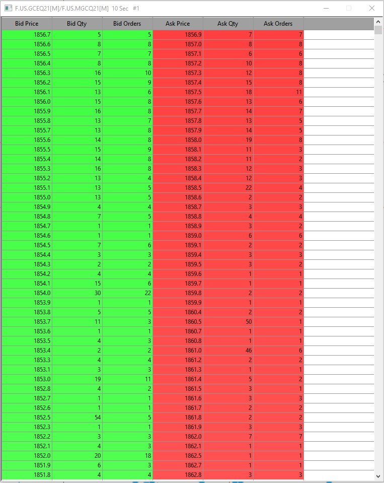 1. I opened up a new chartbook for GC F.US.GCEQ21. The market depth came in fine. 2. I opened up my current chartbook for GC F.US.GCEQ21 and the market depth NOW loads up fine. So now my chartbook has GC data working properly. This is strange behavior, but obviously there is a problem with the chartbook picking up the market depth data. |