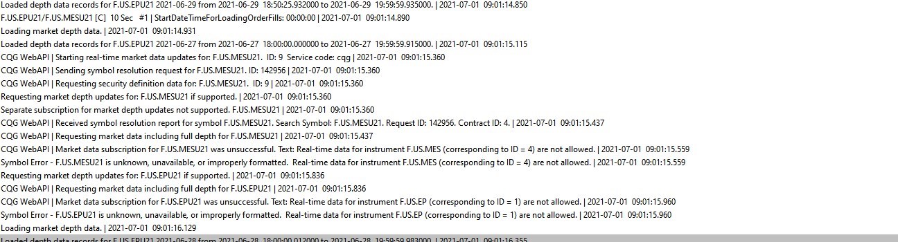 Software version: 2268 64-bit | 2021-06-15 23:12:21.041 OpenGL enabled | 2021-06-15 23:12:21.041 Primary Thread ID: 892 | 2021-06-15 23:12:21.041 Usage end date: 2021-06-25 | 2021-06-15 23:12:21.041 Enabled for: Advanced Features 2. | 2021-06-15 23:12:21.041 Enabled for: Sierra Chart Historical Data Service. | 2021-06-15 23:12:21.041 Enabled for: Denali Real-Time Exchange Data Feed. | 2021-06-15 23:12:21.041 Enabled for: Delayed Denali Exchange Data Feed. | 2021-06-15 23:12:21.041 Enabled for exchange2: CME (Trading Account Required) | 2021-06-15 23:12:21.041 Enabled for exchange2: CBOT (Trading Account Required) | 2021-06-15 23:12:21.041 Enabled for exchange2: COMEX | 2021-06-15 23:12:21.041 Enabled for exchange2: NYMEX (Trading Account Required) | 2021-06-15 23:12:21.041 Allow Support for Sierra Chart Data Feeds is enabled. | 2021-06-15 23:12:21.041 Current selected Data/Trading service: CQG WebAPI | 2021-06-15 23:12:21.041 Custom symbol settings values: enabled | 2021-06-15 23:12:21.041 Chart Update Interval: 500 | 2021-06-15 23:12:21.041 Intraday Data Storage Time Unit: 0 | 2021-06-15 23:12:21.041 Time Zone: -04:00:00 (EST-05EDT+01,M3.2.0/02:00,M11.1.0/02:00) | 2021-06-15 23:12:21.041 2021-06-16 03:12:21 Local computer time in UTC | 2021-06-15 23:12:21.041 2021-06-15 23:12:21 Local computer time in SC Time Zone | 2021-06-15 23:12:21.041 2021-06-15 12:12:04 Server time in UTC | 2021-06-15 23:12:21.041 Local computer UTC time and Server UTC time difference: 1 seconds. | 2021-06-15 23:12:21.041 Program path: C:\SierraChart\ | 2021-06-15 23:12:21.041 Data Files path: C:\SierraChart\Data\ | 2021-06-15 23:12:21.041 OS Version Number: 10.0 | 2021-06-15 23:12:21.041 Locale Setting: C | 2021-06-15 23:12:21.041 DLLs: sst_ateam_2151_64.dll, sst_ateam_64.dll, SST_ATEAM_RX_2151_64.dll, SST_ATEAM_RX_64.dll, UserContributedStudies.dll, UserContributedStudies_64.dll | 2021-06-15 23:12:21.042 Allowed protected custom studies: SST_ATEAM, SST_ATEAM_PS | 2021-06-15 23:12:21.042 Saved Chartbook: updated__gold_5-26-21.Cht. Time: 0.0331 seconds. | 2021-06-15 23:12:47.769 File >> Disconnect selected. | 2021-06-15 23:14:09.247 CQG WebAPI | Sending Web API Logoff message. | 2021-06-15 23:14:09.260 CQG WebSocket socket (3) | CloseSocket call. | 2021-06-15 23:14:09.260 CQG WebSocket socket (3) | Max send buffers used during socket life: 3 | 2021-06-15 23:14:09.260 CQG WebSocket socket (3) | Max send buffer size during socket life: 309 | 2021-06-15 23:14:09.260 CQG WebSocket | WebSocket closed. | 2021-06-15 23:14:09.260 CQG WebAPI | WebSocket closed. | 2021-06-15 23:14:09.260 CQG WebSocket socket (3) | Write in progress. Shutdown being delayed. PendingSize=0 | 2021-06-15 23:14:09.260 SC Data - All Services | Waiting for socket receive thread to end | 2021-06-15 23:14:09.261 DTC Client socket (4) | CloseSocket call. | 2021-06-15 23:14:09.262 DTC Client socket (4) | Shutdown started. Waiting for graceful close. | 2021-06-15 23:14:09.262 SC Data - All Services | Disconnected from the server. | 2021-06-15 23:14:09.262 CQG WebAPI | Disconnected. | 2021-06-15 23:14:09.262 DTC Client socket (4) | Socket gracefully closed by remote side. | 2021-06-15 23:14:09.311 DTC Client socket (4) | Closed. | 2021-06-15 23:14:09.312 CQG WebSocket socket (3) | Write has completed. Shutdown being performed. | 2021-06-15 23:14:09.331 CQG WebSocket socket (3) | Shutdown started. Waiting for graceful close. | 2021-06-15 23:14:09.331 CQG WebAPI | Connecting to server api.cqg.com | 2021-06-15 23:14:20.021 CQG WebSocket | Connecting to WebSocket server api.cqg.com:443 | 2021-06-15 23:14:20.021 CQG WebSocket socket (1) | Creating socket. Using TLS 1.2. | 2021-06-15 23:14:20.096 CQG WebSocket socket (1) | New receive buffer size: 5242880 | 2021-06-15 23:14:20.096 CQG WebSocket socket (1) | Connecting to IP: 208.48.16.35. | 2021-06-15 23:14:20.096 CQG WebSocket | Opening WebSocket. | 2021-06-15 23:14:20.230 CQG WebSocket | Sending WebSocket handshake. | 2021-06-15 23:14:20.230 CQG WebSocket | Server header | HTTP/1.1 101 Switching Protocols | 2021-06-15 23:14:20.484 CQG WebSocket | Server header | Connection: upgrade | 2021-06-15 23:14:20.484 CQG WebSocket | Server header | Sec-WebSocket-Accept: aHrcsaNw7Pzp0LJlvqQuUO7tPtg= | 2021-06-15 23:14:20.484 CQG WebSocket | Server header | Server: WebSocket++/0.7.0 | 2021-06-15 23:14:20.484 CQG WebSocket | Server header | Upgrade: websocket | 2021-06-15 23:14:20.484 CQG WebSocket | Server header | | 2021-06-15 23:14:20.484 CQG WebSocket | Web socket state is now open. | 2021-06-15 23:14:20.484 CQG WebAPI | WebSocket connected. | 2021-06-15 23:14:20.484 CQG WebAPI | Sending market data logon message. | 2021-06-15 23:14:20.484 CQG WebAPI | Base Time: 2021-06-13T02:34:45. 2021-06-13 02:34:45 | 2021-06-15 23:14:20.694 CQG WebAPI | Logon successful. Session Token = dDkgZDnNjUJ+2Hh0O+5D5YZK8q6zyvRvcLot5NyxoPcYTGYDjC/pGcI6Gx4w2Ued5TB/2gX9Lgi | 2021-06-15 23:14:20.694 CQG WebAPI | Connected to server complete. | 2021-06-15 23:14:20.694 Triggering next historical data download in queue. | 2021-06-15 23:14:20.695 Triggering next historical data download in queue. | 2021-06-15 23:14:20.695 Triggering next historical data download in queue. | 2021-06-15 23:14:20.695 Triggering next historical data download in queue. | 2021-06-15 23:14:20.695 Updated verified funded futures trading account ending date to: 2021-07-16 03:14:20 | 2021-06-15 23:14:20.695 CQG WebAPI | Sending Trade Accounts request message. | 2021-06-15 23:14:20.708 No download requests in the queue to start downloads for. | 2021-06-15 23:14:20.709 No download requests in the queue to start downloads for. | 2021-06-15 23:14:20.709 No download requests in the queue to start downloads for. | 2021-06-15 23:14:20.709 No download requests in the queue to start downloads for. | 2021-06-15 23:14:20.709 Mapping F.US.MGCQ21 to MGCQ21. Service code: comex | 2021-06-15 23:14:20.710 SC Data - All Services | Starting real-time market data updates for: F.US.MGCQ21 (M