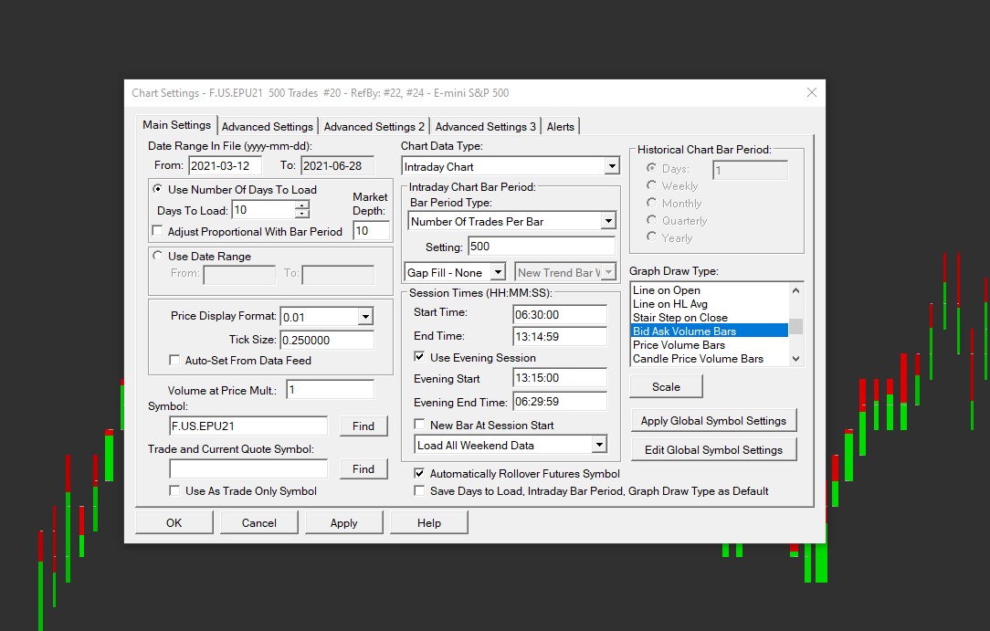 Here's an image of the chart settings. It's better to show you in a video what happens in real time which is also attached. This is a replay from Globex. You can clearly see what's happening.