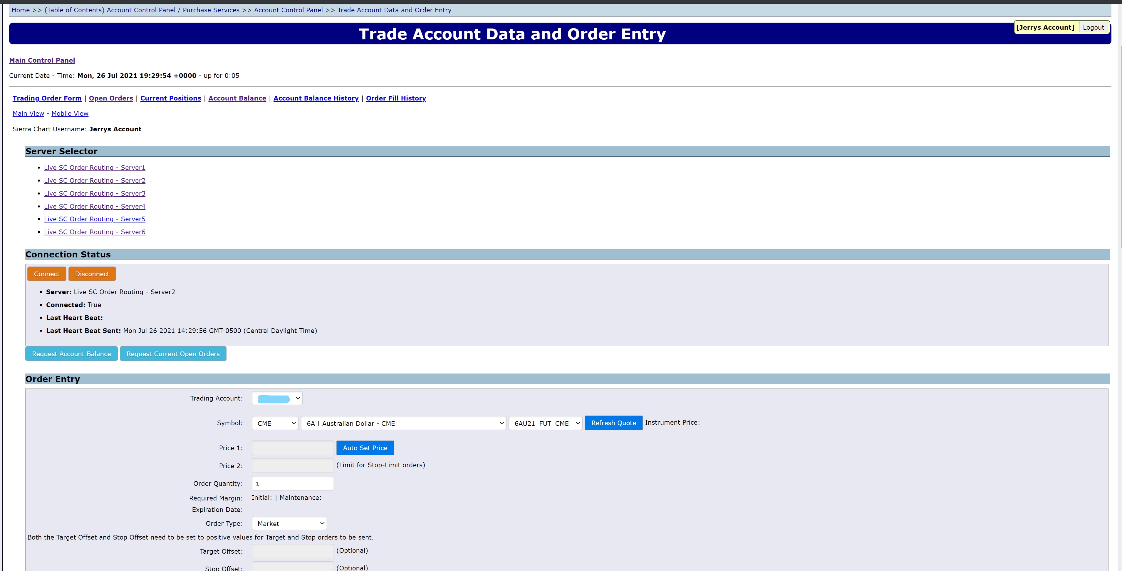 Our servers are showing that you are connected to CQG. Therefore, you would NOT be using the Sierra Chart Order Routing service. Also, what window are you referring to in terms of the "account control/trade panel"? For the most reliable, advanced, and zero cost futures order routing, use the Teton service: Sierra Chart Teton Futures Order Routing |