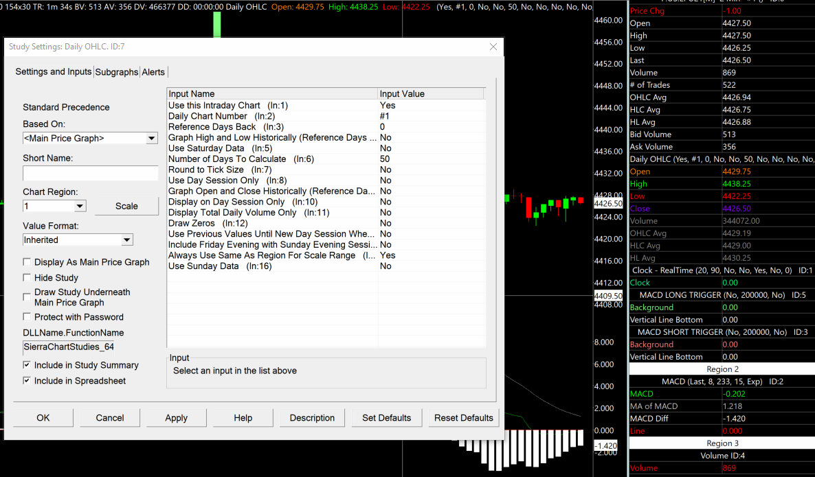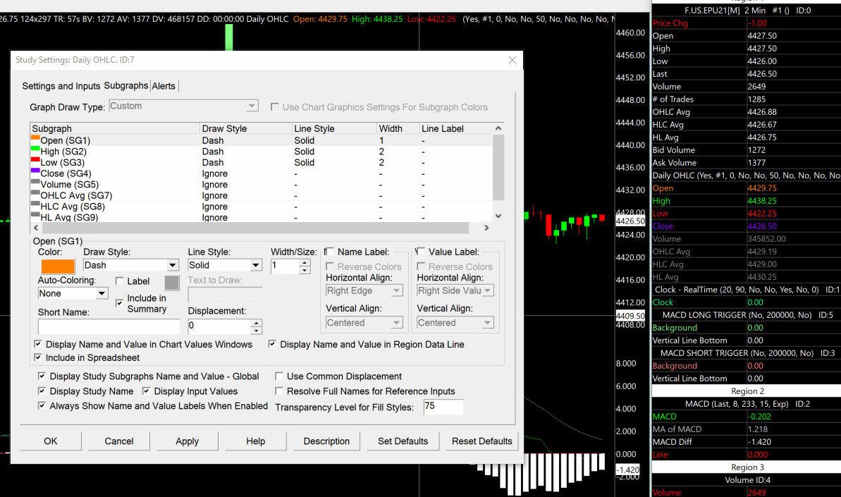 Good morning, I am attempting to use the Daily OHLC study and cannot seem to find a way to get it to display on the main graph with the candlesticks. For what it is worth, I tried using VWAP and it will not display either. Updated to version 2292 this morning. Worked through most trouble shooting documents and posts in the support board to no avail. Please help, Thanks. First image is Region 1 without the OHLC lines graphed but showing correct values in Chart Values window. Second image is the Daily OHLC settings. Third image is Daily OHLC subgraph settings. |