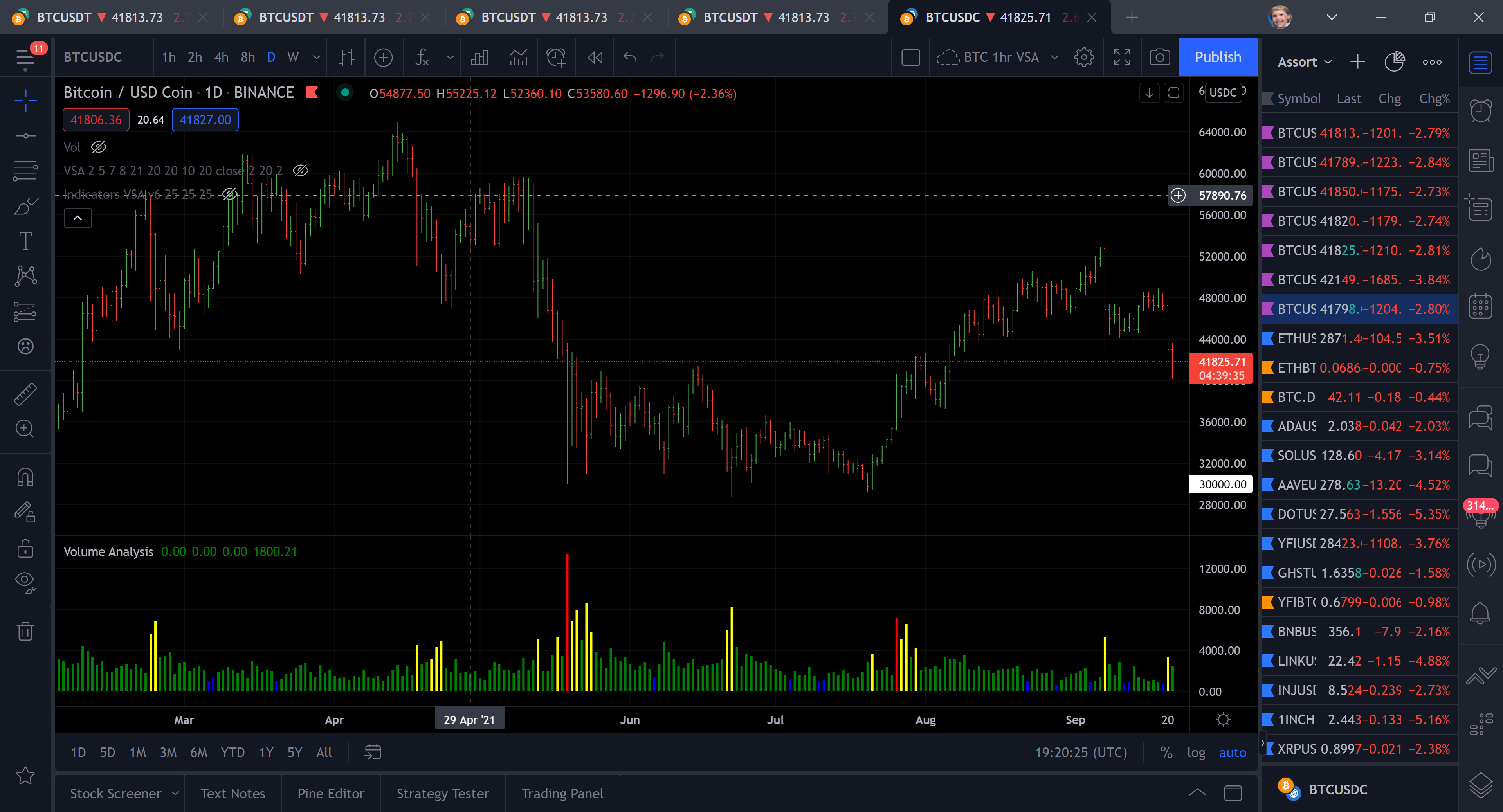 My apologies but I'm not too sure what else to say... I presented you with objective data in the form of comparative screenshots so how you can say it "has no basis in fact or reality" is odd. I am very familiar with Binance and the instrument you mentioned with the link you provided (Bitcoin/TetherUS Perpetual Futures) is not what I am interested in at all. I will attach more screenshots to illustrate this issue further as it is not just in the #1 main BTC pairing on Binance (BTC/USDT) that shows this issue (as I have demonstrated in the screenshots above). I have attached screenshots of the second most popular BTC pairing, BTC/USDC, in both Sierra & TradingView. Again, notice the major discrepancy on the low on May 19th. I would also like to add that Binance uses TradingView directly on their trading dashboard so you can rest assured it is accurate. |