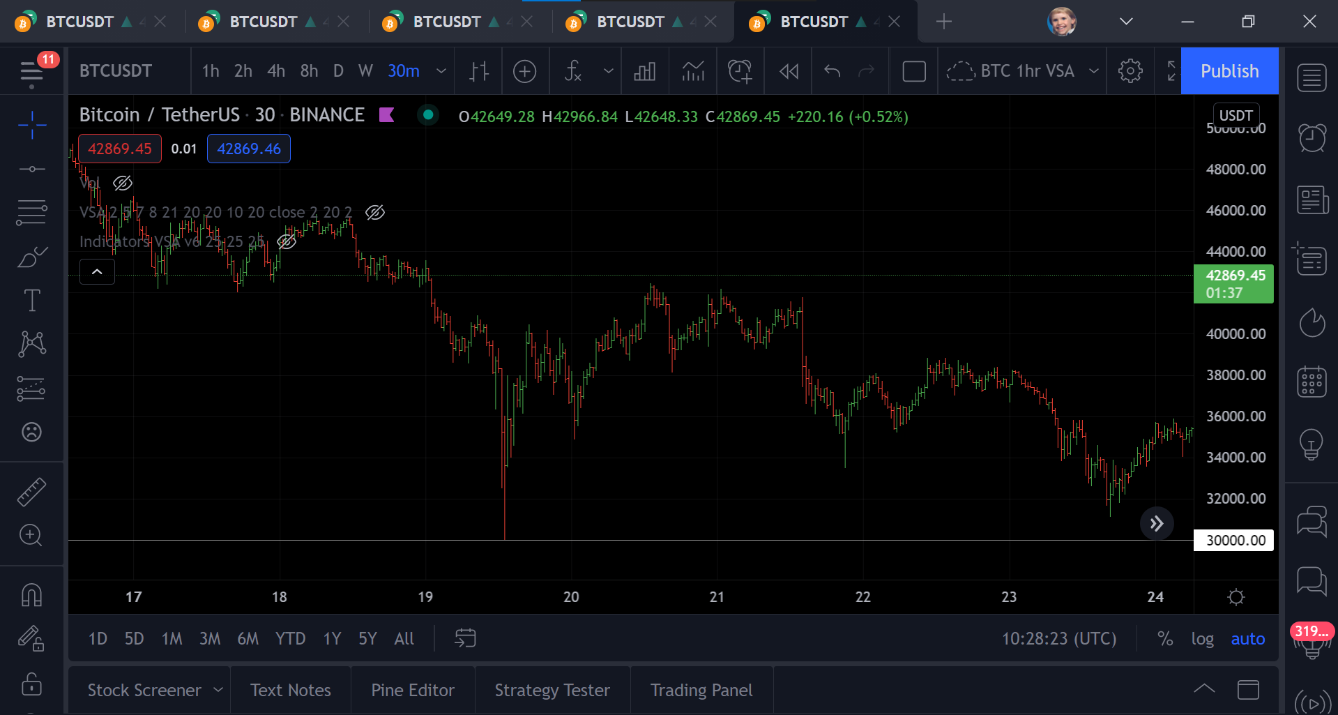 I have attached the Binance BTC/USDT 30min intraday chart from both Sierra & TradingView and the discrepancy still exists to the same extent. I have also attached the Bitfinex BTC/USD 30min intraday chart from Sierra as oddly enough it seems to be spot on, hitting that 30k low. All charts are from May 17th-24th. Thanks, |