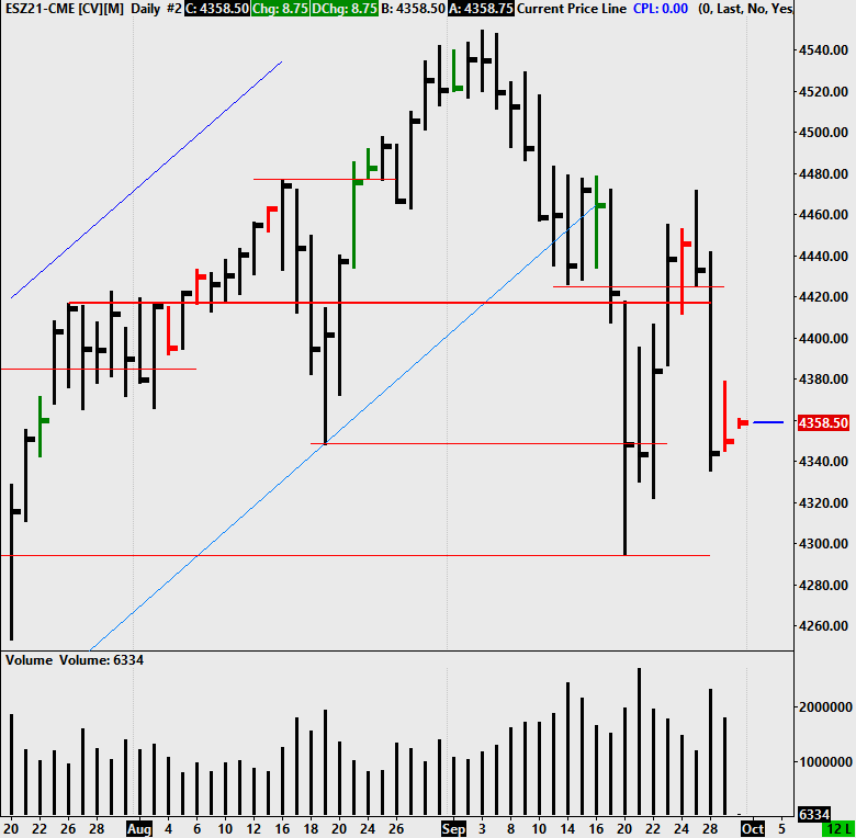 The ESZ21 daily chart shows the highest volume being on 9-21-21 but everywhere I look it shows the highest volume day being 9-20-21. The daily chart for CLX21 completely left out 9-29-21 daily bar. It shows 9-28-21 and then a big gap down and the next bar is 9-30-21. |