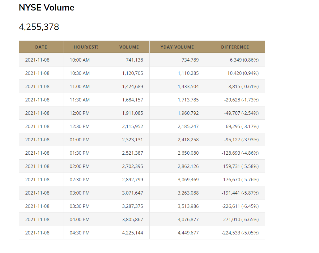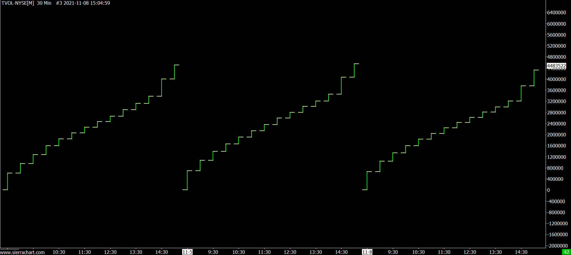 Then you would want to use the TVOL-NYSE. The description for this is the following (note that this is reported in thousands, so you would need to multiply by 1000 to get the actual volume): TVOL The total volume of stocks for the particular exchange or index the symbol is for that have traded in the current trading day . 2015-11-27: At the 9:30:00 US Eastern time open of the NYSE and NASDAQ, this volume calculation is reset back to 0. 2017-05-31: This symbol is only calculated during the day trading session. Reported in thousands. -------------- You will find the descriptions for each of the symbols in the market statistics at the following link: Sierra Chart Market Statistics: Symbols For the most reliable, advanced, and zero cost futures order routing, use the Teton service: Sierra Chart Teton Futures Order Routing Date Time Of Last Edit: 2021-11-08 21:39:13
