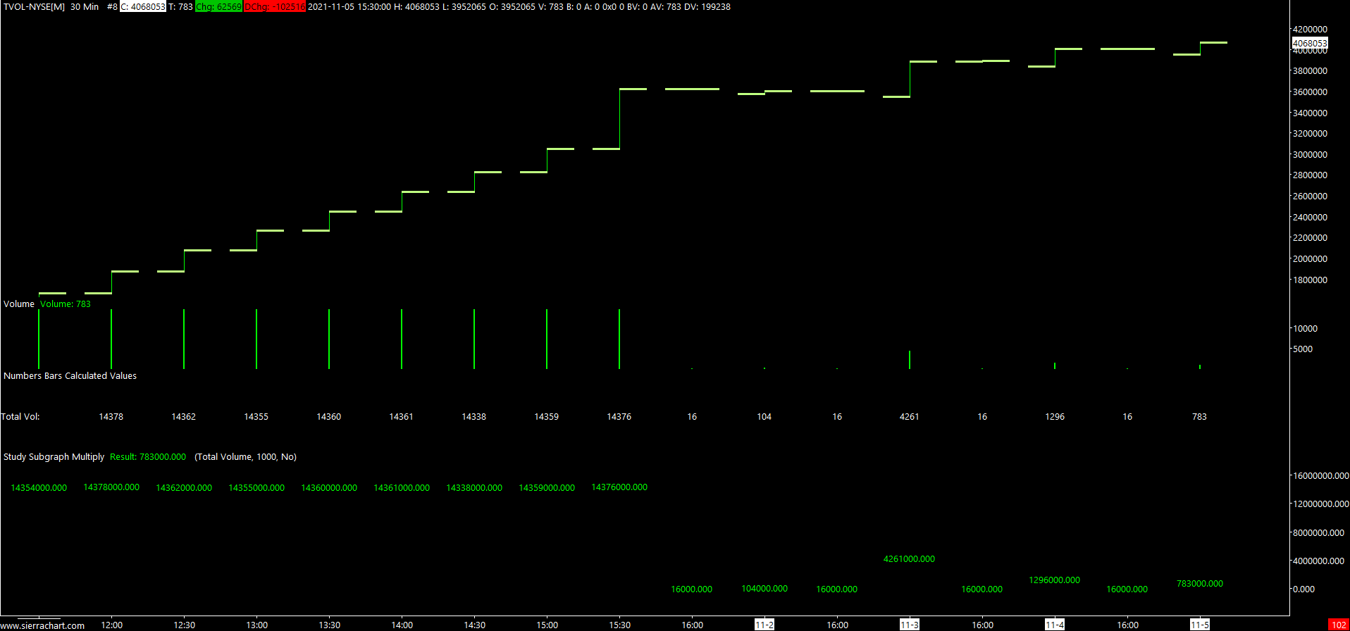 Here is what the TVOL-NYSE looks like for us with a 30 minute setting: http://www.sierrachart.com/image.php?Image=1636407831717.png Are you opening an Intraday Chart or an Historical Chart? To multiply by 1000, you can use the VAP Multiplier and set it to 1000. Or you can use the Study Subgraph Multiply to multiply the volume by 1000 and output that to another region. Refer to the following: Using the Basic Arithmetic Studies For the most reliable, advanced, and zero cost futures order routing, use the Teton service: Sierra Chart Teton Futures Order Routing |