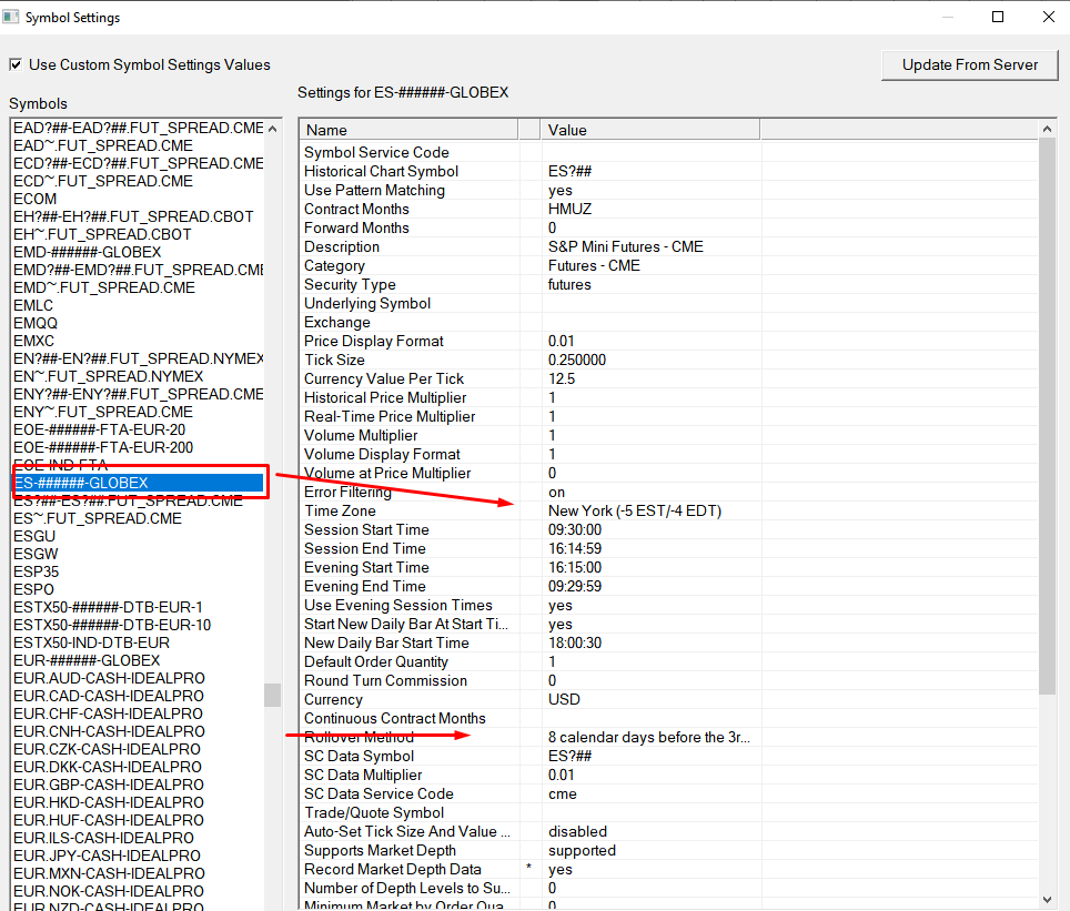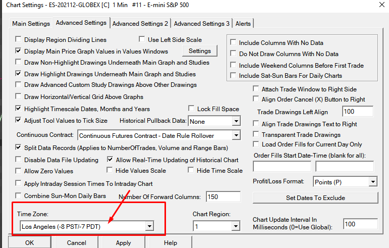 This has nothing to do with Time Zones. The Time Zone setting in the Symbol Settings is establishing the Time Zone for the entry of the Start and End times of the Session Times in the Symbol Settings. That is all. If you like to see your charts in PST, then what you have set is also fine. Although it is easier to set the Global Time Zone (in Global Settings >> Time Zone Settings) and use that global time zone for your charts. With regards to the lock fill space, you can also temporarily lock the Fill Space by holding the Ctrl button and scrolling to the right. In the end, what you want to do is look at the number that is displayed in the bottom right corner of the screen and ensure that it is highlighted in Green. If it is green and you are still not seeing the most recent bar's information, then something else is going on. Otherwise, make sure you scroll the chart bars back to the left until you get a green highlighted number in that corner, at which point you will have scrolled to the end. If you still have an issue, then we would need to get a copy of your chart by following these instructions: Support Board Posting Information: Providing Chartbook with Only a Single Chart For the most reliable, advanced, and zero cost futures order routing, use the Teton service: Sierra Chart Teton Futures Order Routing |