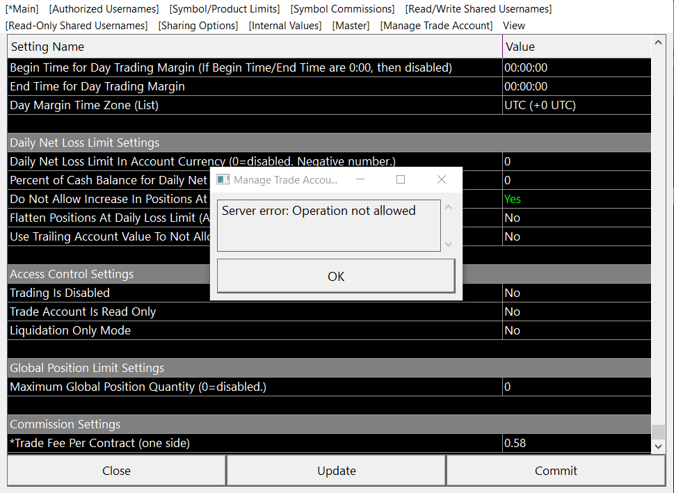 When in "Live Mode" the Trade Account Monitor Window shows a error (see attached) when trying to edit any options like (comm, margins, daily lost, etc. |