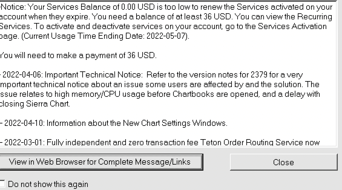 Once again your Sierra Chart account is fine. That message looks like an old message as it is no longer present on your account. That does not help us. We need to see the Message Log. Are you having a problem currently? Sierra Chart Support - Engineering Level Your definitive source for support. Other responses are from users. Try to keep your questions brief and to the point. Be aware of support policy: https://www.sierrachart.com/index.php?l=PostingInformation.php#GeneralInformation For the most reliable, advanced, and zero cost futures order routing, *change* to the Teton service: Sierra Chart Teton Futures Order Routing Date Time Of Last Edit: 2022-05-09 13:16:39