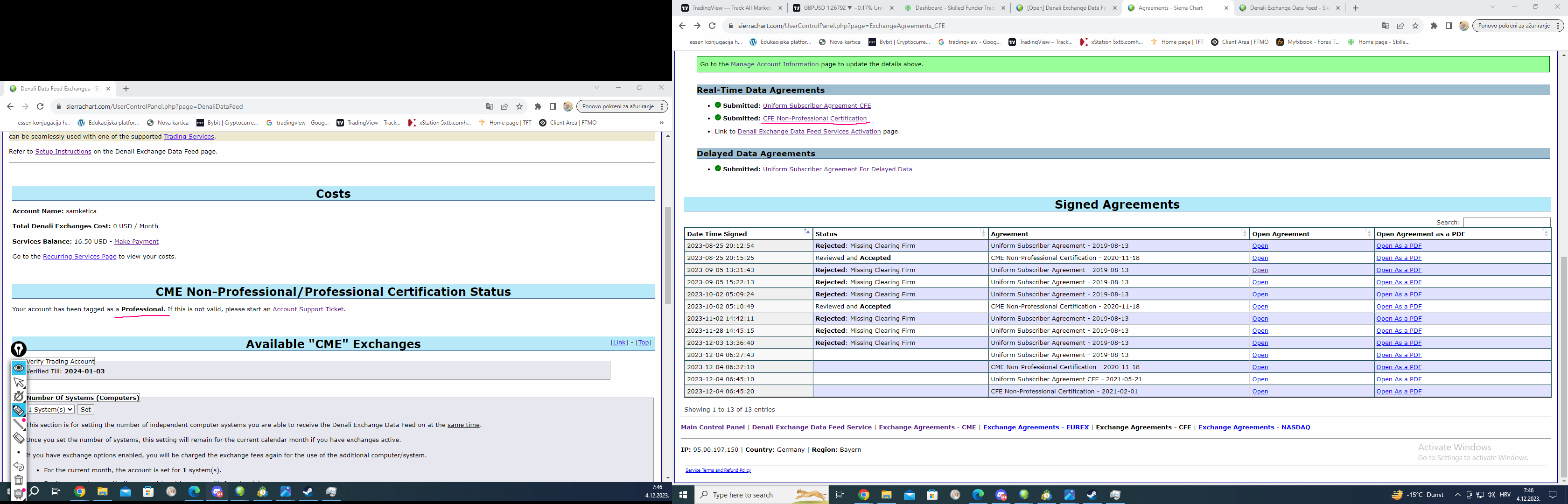 Good stuff Devon, please re-complete the Market Data Agreements and be sure to include your AMP Futures Trading Account Information; your "Clearing Firm" will be "AMP Futures" and your "Futures Trading Account Number" is something like "AC123456". https://www.sierrachart.com/UserControlPanel.php?page=ExchangeAgreements Then you need to connect Sierra Chart to your AMP Futures Trading Account in order to verify your Non-Professional status, for that AMP can provide you with the CQG WebAPI login credentials and with those in-hand, here are your set up instructions: CQG Trading Platform Service: Setup Instructions |