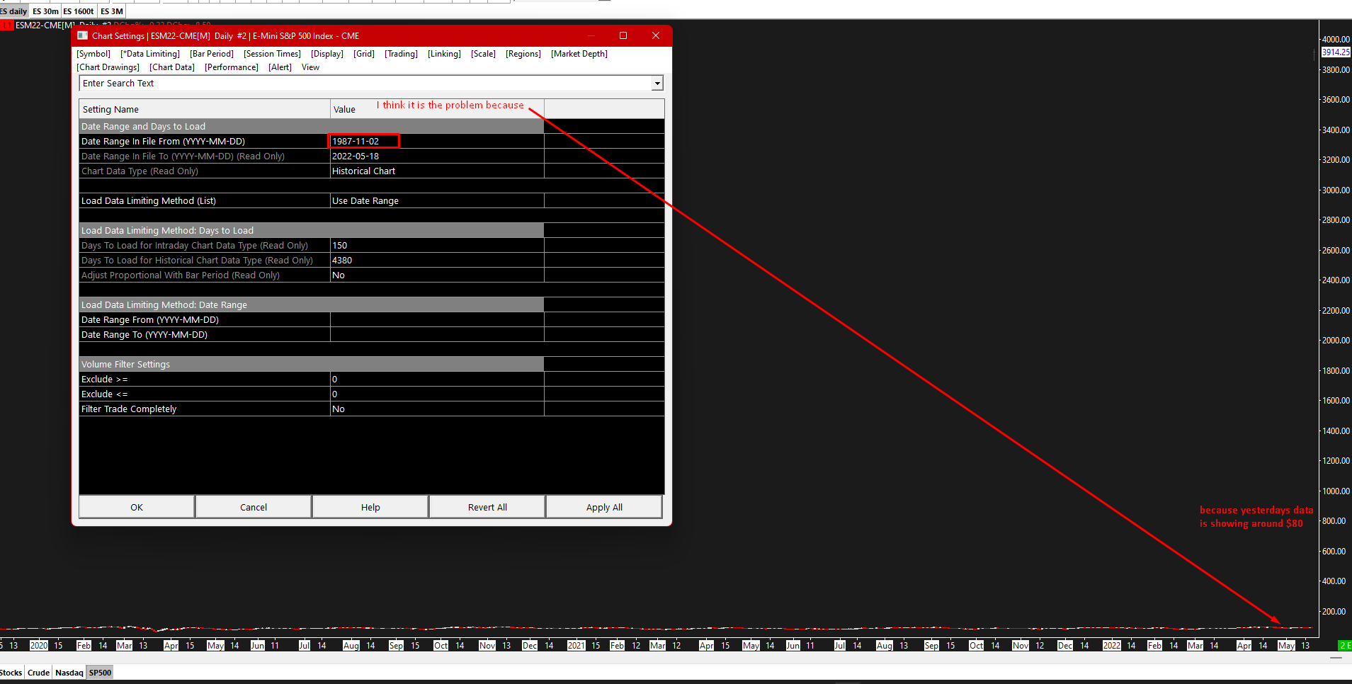 On ES/NQ My daily charts are not showing the acrtual chart but intraday ones are okay, Could you help with this?