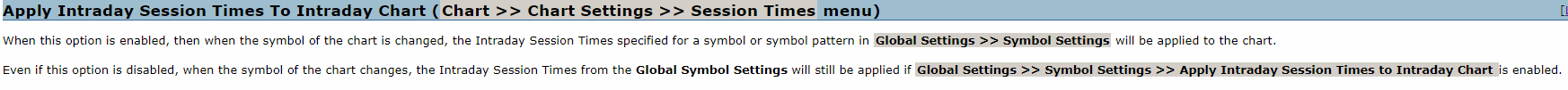 Yes that is correct. I want to be able to enter the session times for ES (9:30-1400) for example. Switch to CL and have the session times be accurate for CL (9-14:30). But when I switch from ES to CL, the session times for CL are that of ES. I've read this "Chart Session Times: Session Times Automatically Changing Unexpectedly" and done this "You need to set two different items to be disabled (no). First, set Chart >> Chart Settings >> Session Times >> Apply Intraday Session Times To Intraday Chart to No. Then ensure that the option for Global Settings >> Symbol Settings >> Apply Intraday Session Times to Intraday Chart is not enabled (unchecked)." And still cannot figure it out. |