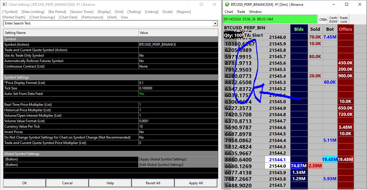 Maybe I was not understood because your answer is out of subject, so I'll try to rephrase the main problem. A contract is worth 100$ in BTC inverse perpetual futures, but when a contract is being bought or sold your DOM displays 10K instead of 1 (and of course similarly when multiples of a contract are being bought or sold, which is the most common). In normal perpetual futures, a contract size is the minimum quantity of a cryptocurrency that can be bought or sold (for example 0,0001 BTC), but when it is bought or sold your DOM displays a number that is 10 THOUSAND TIMES larger at the "bid/ask trade size" column (for example 1 BTC). That's what's causing the issue with the volume, and volume is not the main issue because it is caused by the above problem and there is a fix for it in chart settings anyway. Please address the problem I described in the first paragraph. |