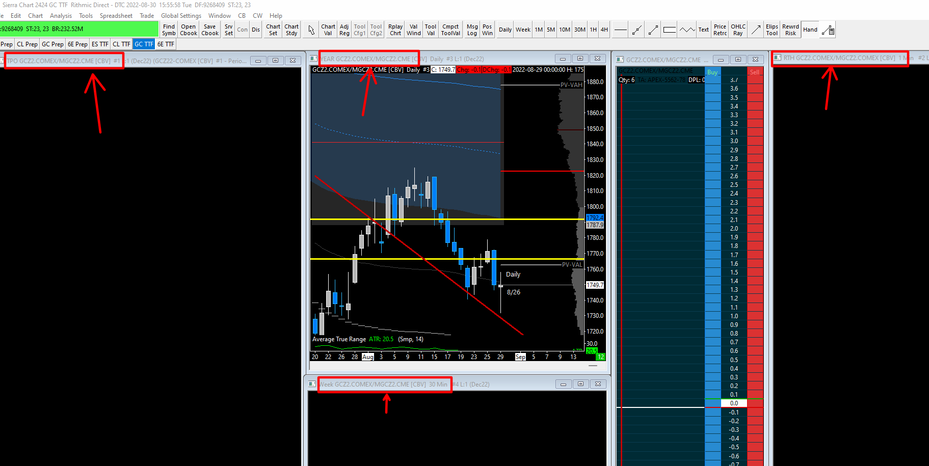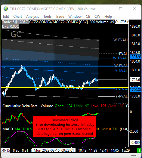 Something tells me that if my username or password were incorrect then I wouldn't be able to access every ticker symbol that I try. I've tried markets that I don't trade and they populate just fine. Thake a look at the screenshots. I don't know why the MGC trade symbol is showing CME. I manually change it to MGCZ2.COMEX in the Chart settings/symbol settings and it doesn't make a difference. this looks like it might be the problem but even I don't know how to fix it. |