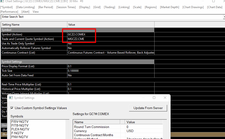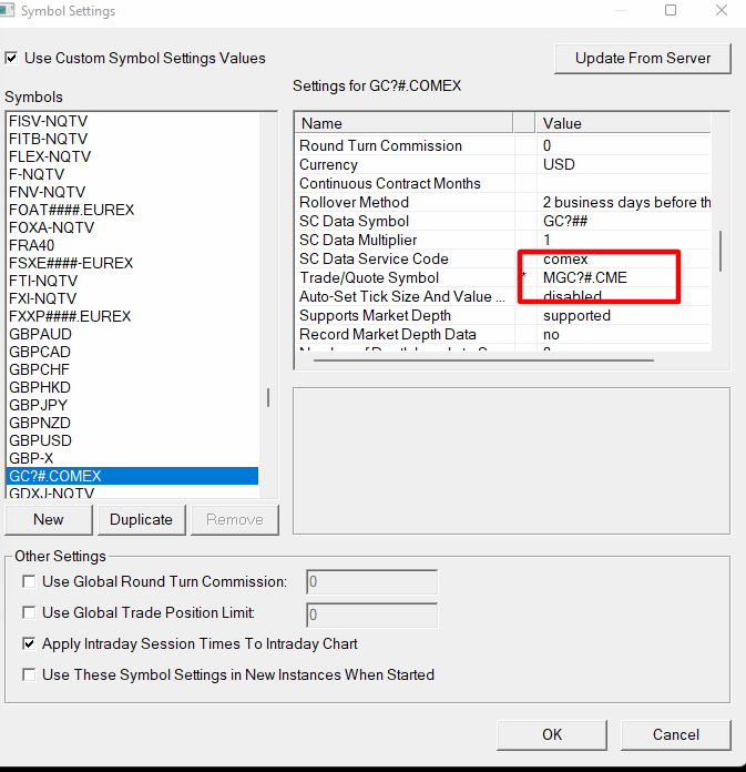 You need to change the symbol name in the symbol settings for GC#?.COMEX. To do this, select Global Settings >> Symbol Settings and find the entry for GC#?.COMEX as you had done in the screenshot you provided. Then in the settings for that symbol scroll down to the Trade/Quote Symbol entry and select it. The information for that entry will show up below that area. Change the entry there to MGC#?.COMEX and then select OK to close the symbol settings. Then go back to your Chart Settings and update the entry for the Trade and Current Quote Symbol for that chart. You should be fine after that. For the most reliable, advanced, and zero cost futures order routing, use the Teton service: Sierra Chart Teton Futures Order Routing |
