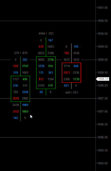 First, you setup your number bar with colours, Bid vl x ask, column 1 colouring method: Text on diagonal Dominant side. You can then adjust colours as you want. Second, you create another chart bok with a candle chart for the same intrument (not sure it has to be the same but anyway). THen you add the study : Price overlay to add to the chart that contains the number bars, and you choose the chart number corresponding to the candle chart you've created. You then set the region to 1 (same as number bar view), and check the option "draw study underneath main price graph). This way you will have full candles, and you will see the figures above it. If you wznt candles to be hollow, just make you candle chart hollow, and then check "use colours from study": YES in the Price overlay settings. I hope this makes sense. Pls note this is doing exactly the same as your inital chart, i.e, shows volume imbalances diagonally (the way a footprint chart should be read, bid/ask view). |