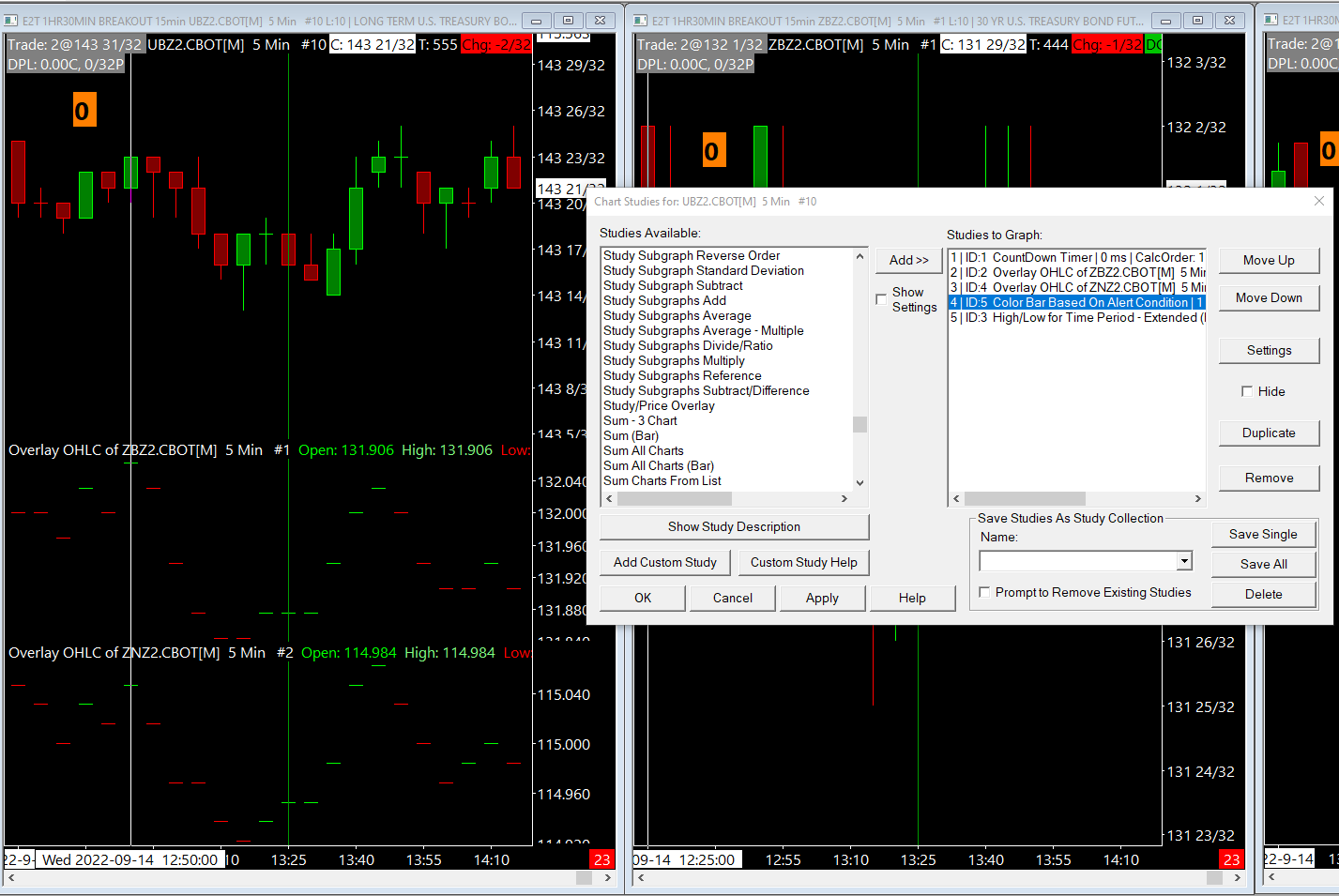 We do not quite follow exactly what is occurring, but from what we see, it looks like you are overlaying the entire set of bars from other symbols to this chart. The better way to do this is to use the Add Additional Symbol study. This is a much cleaner method. Then, you can reference the Open, High, Low, or Close of that symbol for your Color Bar Based on Alert condition by referencing the subgraphs for the particular item. What you were doing should work, at least from what we understand, but again, the Add Additional Symbol is a less intensive method for doing the same thing. For the most reliable, advanced, and zero cost futures order routing, use the Teton service: Sierra Chart Teton Futures Order Routing |