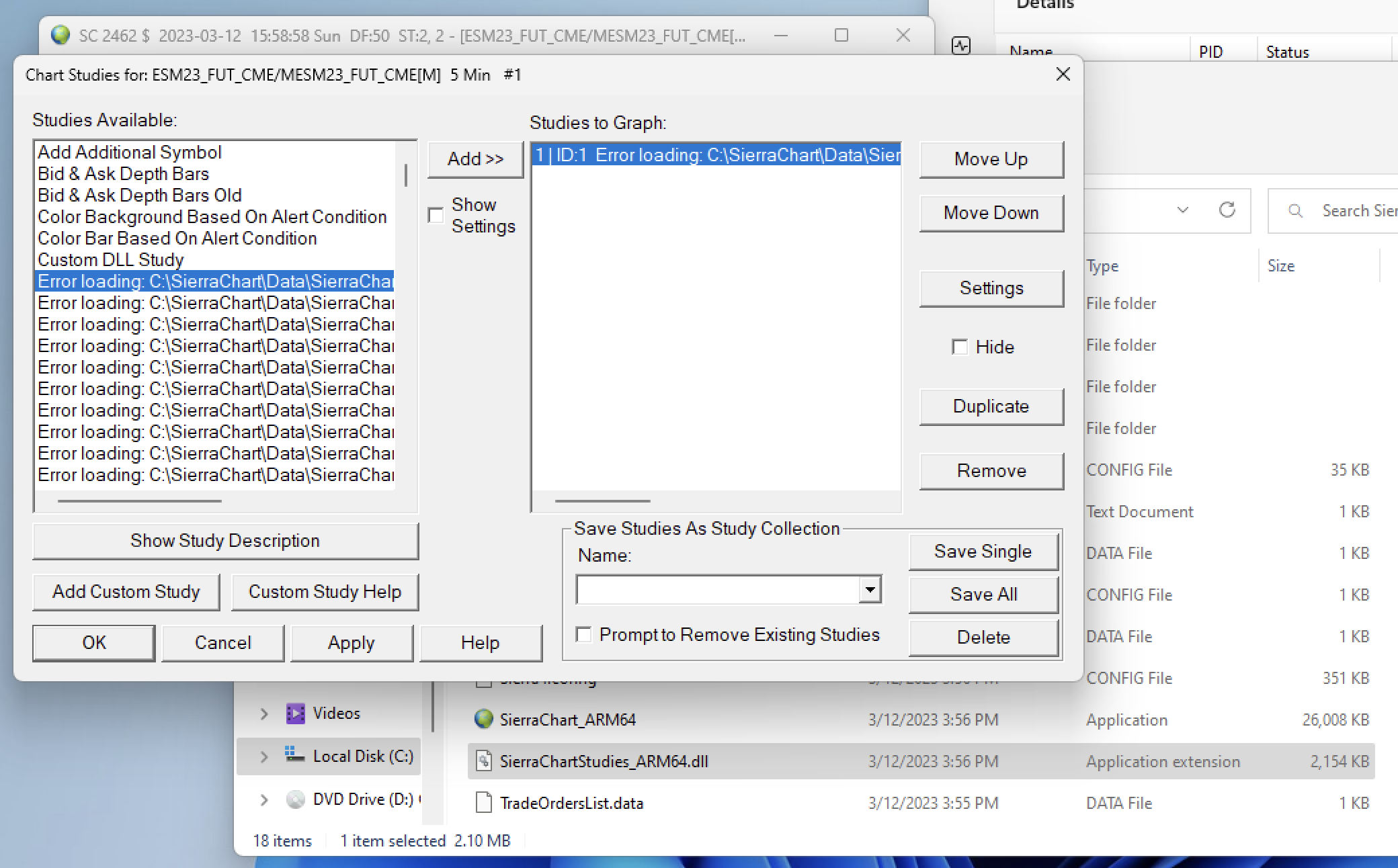 Thanks so much for the quick reply and help for something that I am sure it not a main priority. I appreciate it! So to avoid any "contamination", I did a completely fresh install from the zip file, and I still ran into the same error. I did find the following in the message log that may be of some help: Found DLL: SierraChartStudies_ARM64.dll | 2022-12-12 14:01:52.443 Found DLL: UserContributedStudies_64.dll | 2022-12-12 14:01:52.443 SierraChartStudies_ARM64.dll is not 64-bit | 2022-12-12 14:01:52.445 VersionNumber is 0 for SierraChartStudies_ARM64.dll | 2022-12-12 14:01:52.445 InternalVersionNumberToFileNameMap is empty for SierraChartStudies_ARM64 | 2022-12-12 14:01:52.445 * Closest match search for: C:\SierraChart-Arm\Data\SierraChartStudies_ARM64.dll returned empty result. | 2022-12-12 14:01:52.445 * I thought this line in particular may be of some significance: "SierraChartStudies_ARM64.dll is not 64-bit" Date Time Of Last Edit: 2022-12-12 14:06:30