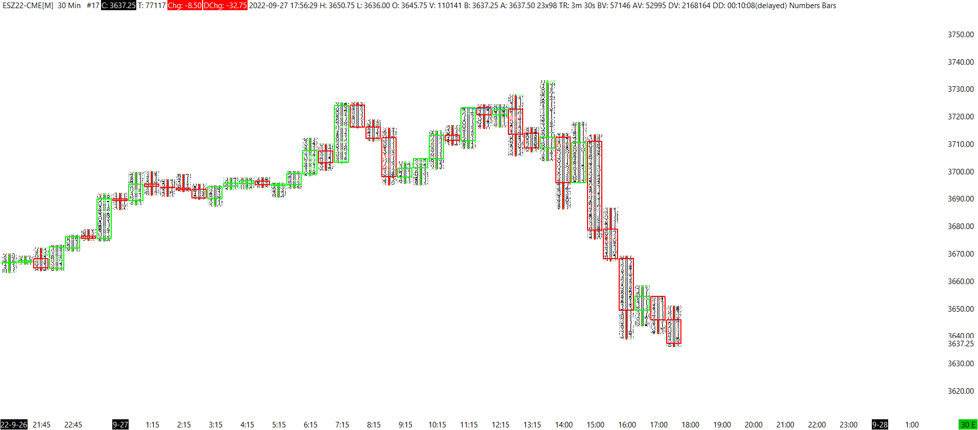 It is not an error, it is just the nature of the data for the index. It is not the best instrument to start working with Numbers Bars (the CME Group ES instrument is a widely traded instrument that will show the Numbers Bars well). But, in general it's a matter of scaling to fix what you are looking at. Refer to the information here: Numbers Bars: Scaling a Numbers Bars Chart For the most reliable, advanced, and zero cost futures order routing, use the Teton service: Sierra Chart Teton Futures Order Routing |