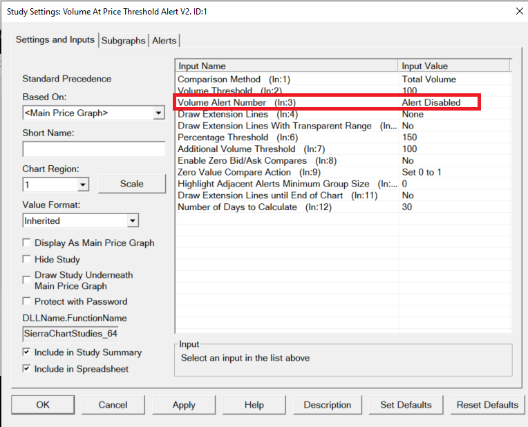 On the Volume at Price Threshold Alert V2 you just need to set the Alert number you want on the Input for Volume Alert Number. You do not need to do anything with the Alert tab itself. Refer to the information here: Volume at Price Threshold Alert V2 For the most reliable, advanced, and zero cost futures order routing, use the Teton service: Sierra Chart Teton Futures Order Routing |